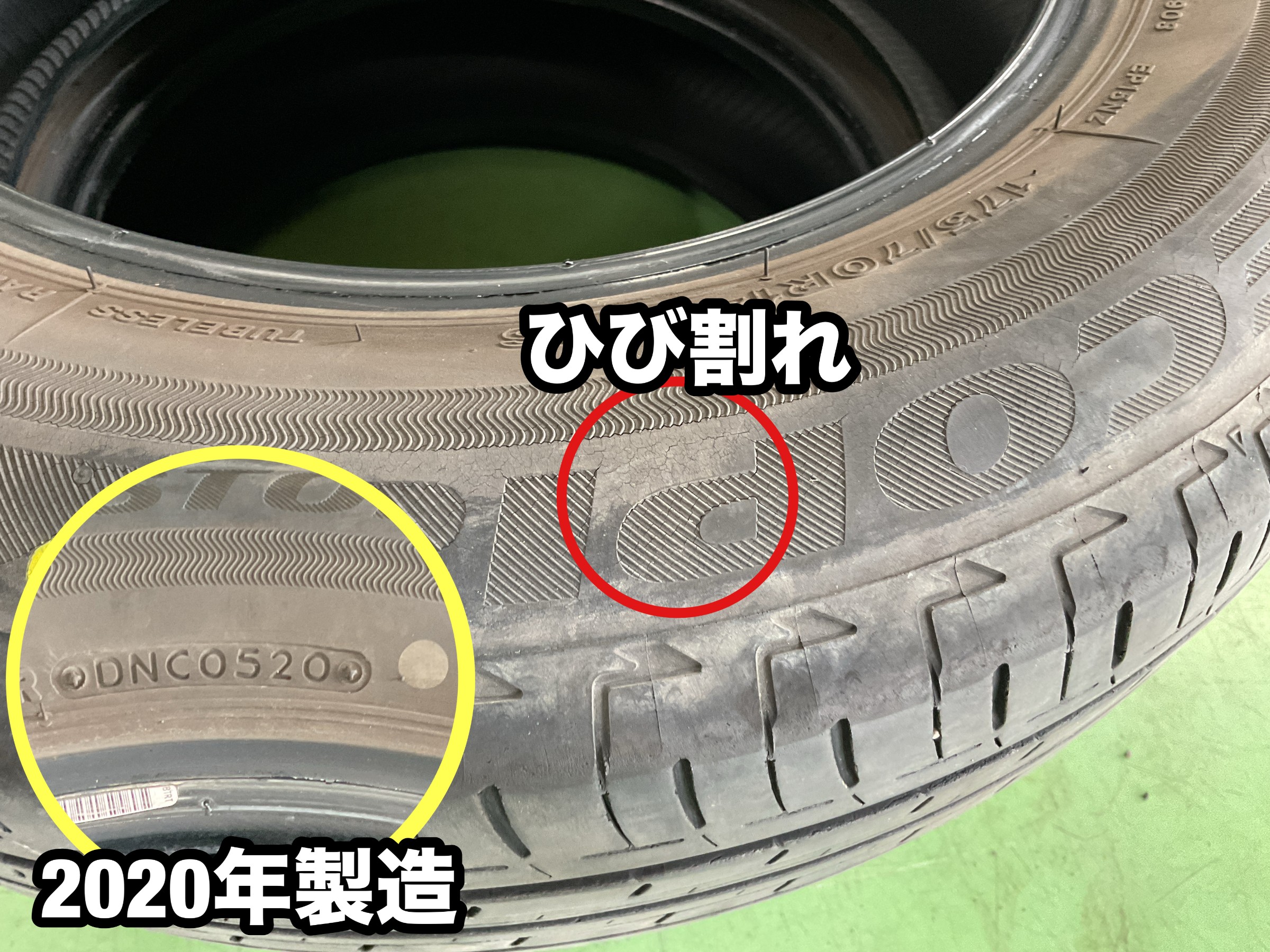 新車装着のタイヤで経年劣化によるひび割れがあります。