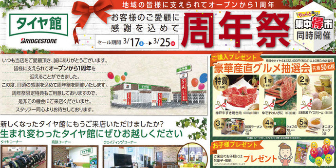 タグ:タイヤ館・成田市・リニューアル・周年祭・セール・イベント・タイヤセール・広告・チラシ・ブリヂストン