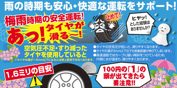 雨の季節は、溝の少なくなったタイヤでの運転中にヒヤッと危険を感じ、タイヤ点検にご来店くださるお客様も増えてまいります。