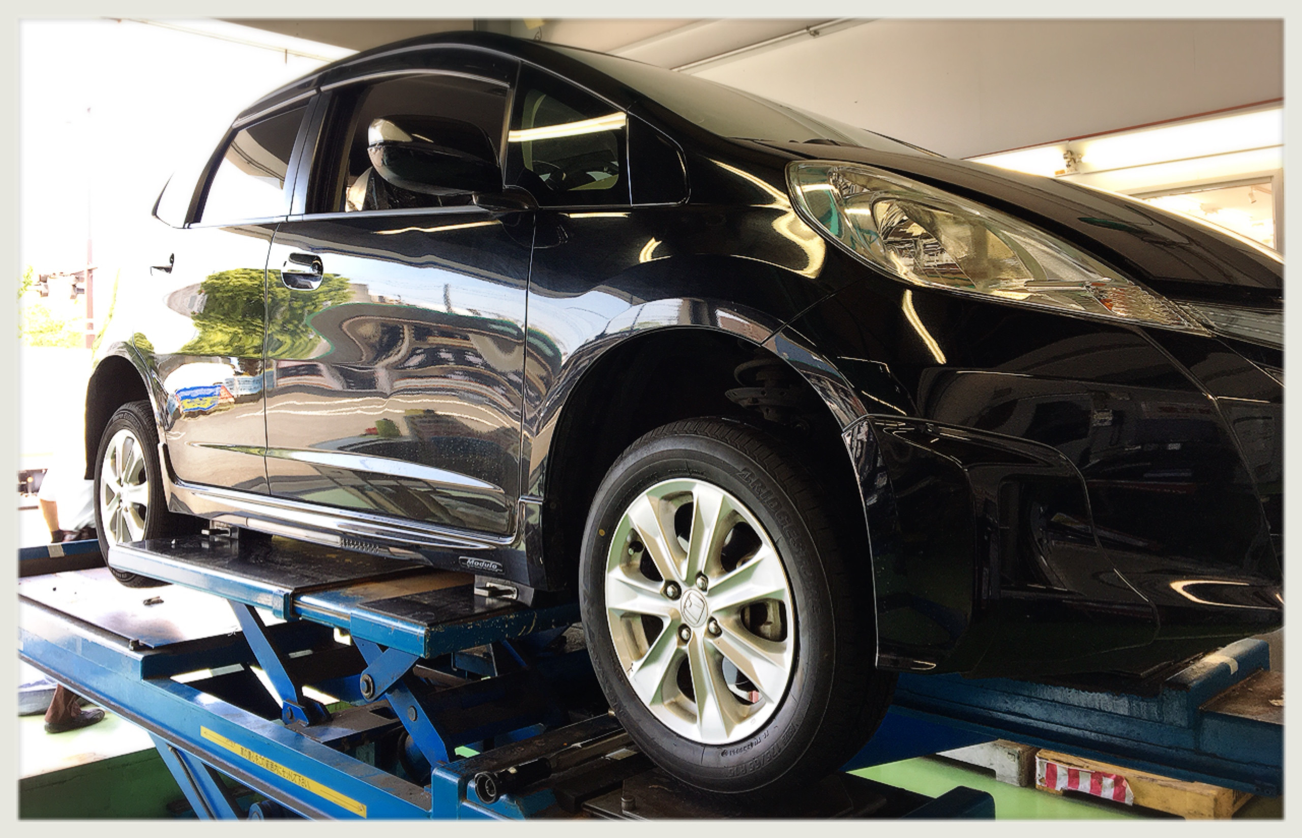 というわけでタイヤ交換の後は、その微妙な角度の狂いを測定し、タイヤの偏摩耗の軽減、直進時や旋回時の走行の安定性向上のため、バランスよく良好な状態となるよう調整を行なう「アライメント」の作業をして終了となりました!!d(・∀・○)