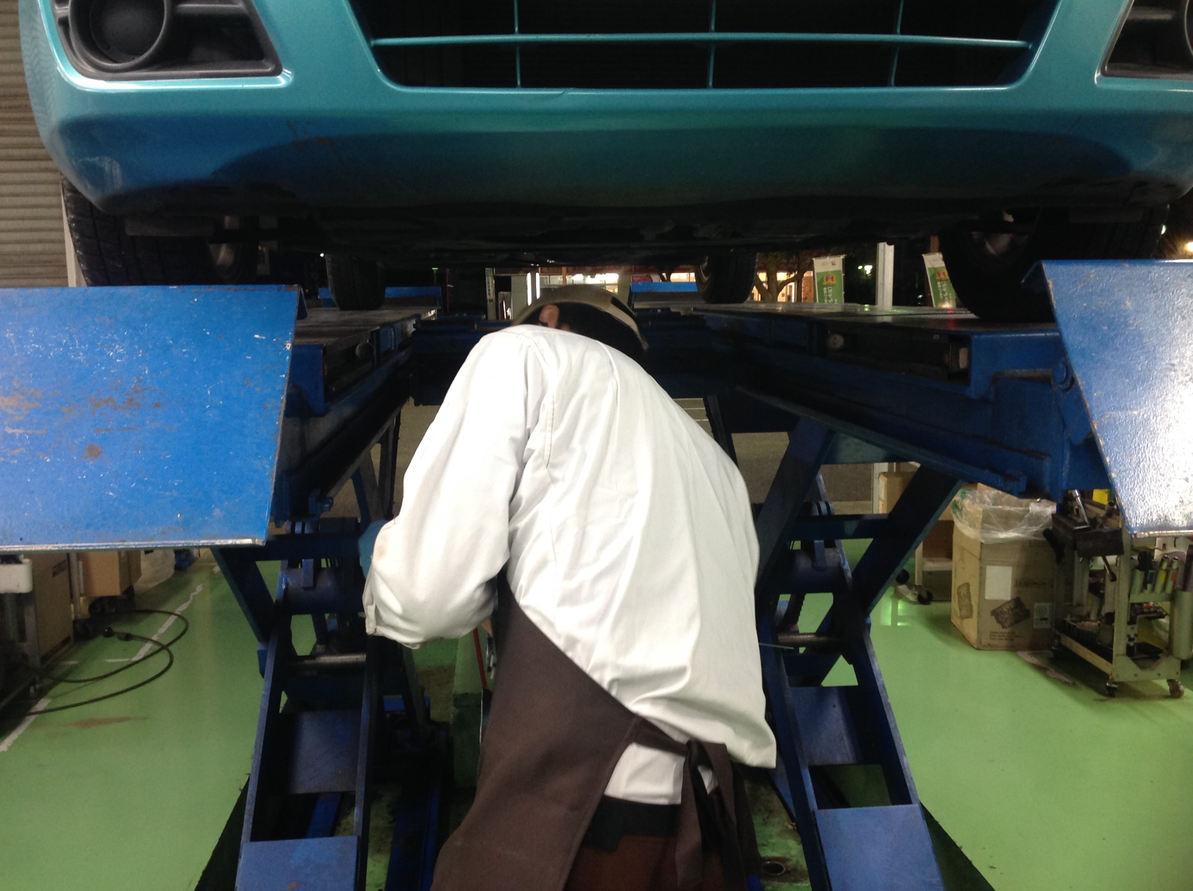 成毛スタッフが車体の下に潜って、しっかりと下回りの点検をしながら作業していただいております!