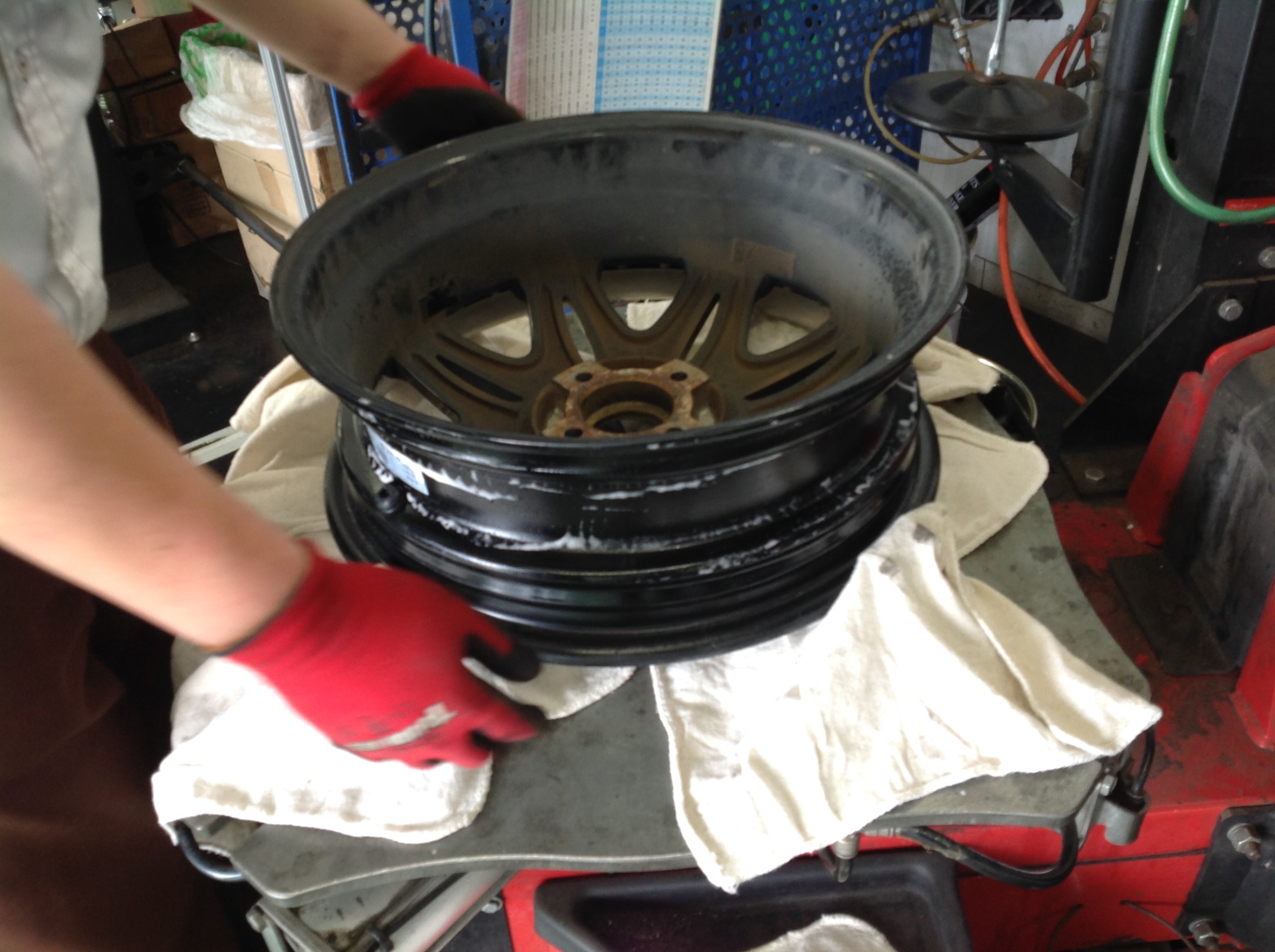 チャッキングそしてタイヤ取り外し後、ここでも布が敷いてあるのは傷つけないようにするためです。