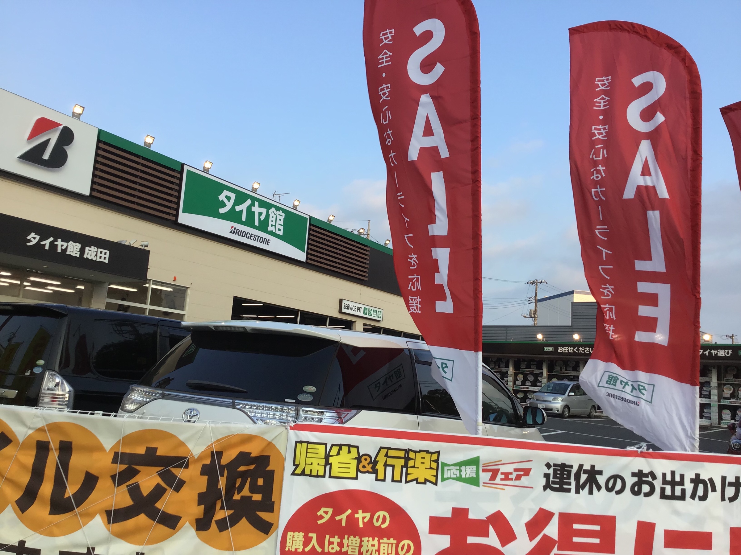 タグ:タイヤ館・ブリヂストン・応援フェア・帰省・行楽・増税前・タイヤ・アライメント・ドライブレコーダー・エンジンスターター・窒素ガス・センターフィット・バッテリー・エンジンオイル・ATF・ワイパー・エアコンフィルター・点検・無料点検・成田市・公津の杜・イトーヨーカ堂・ENEOS・yourELM・ワークマン