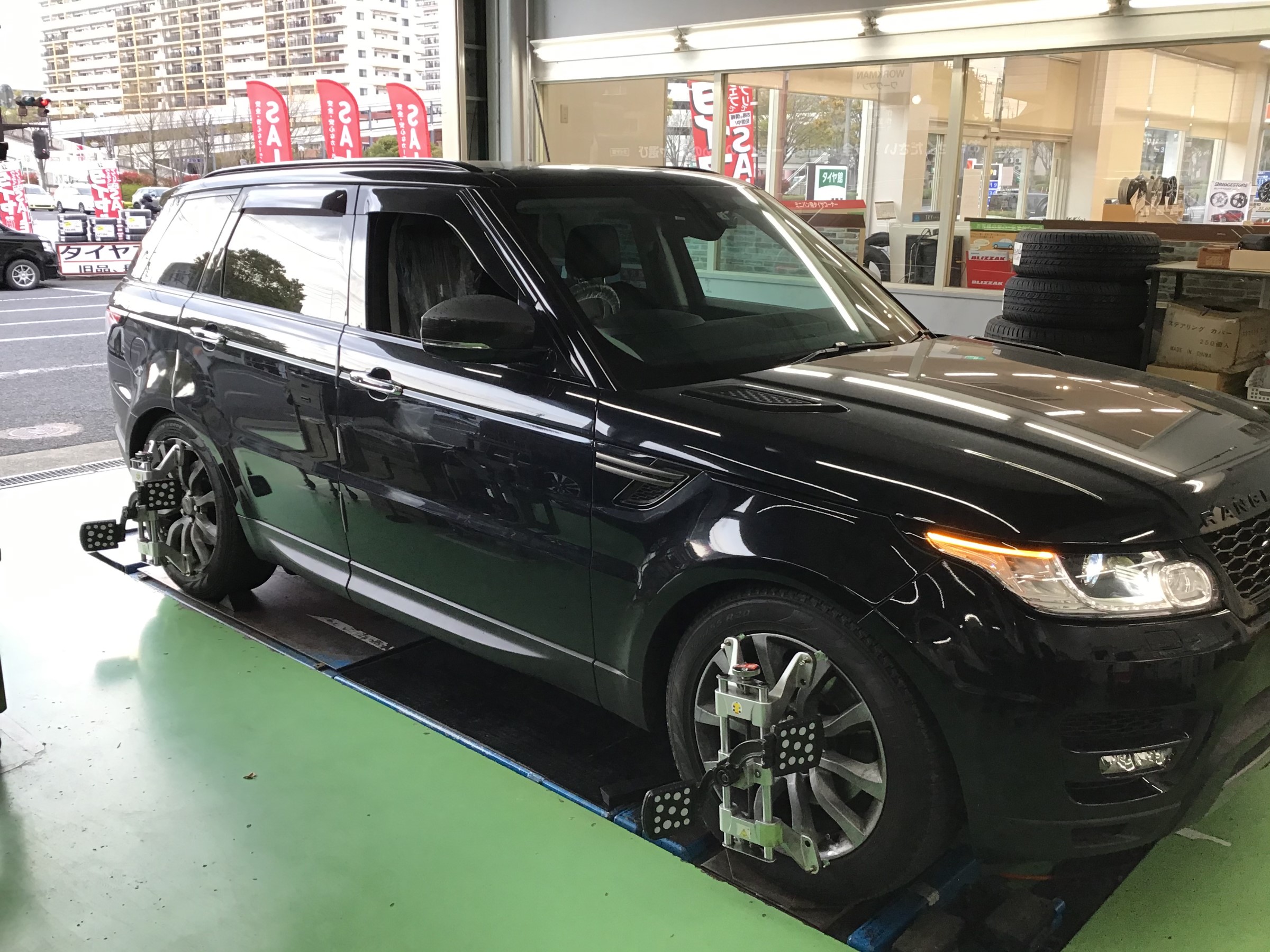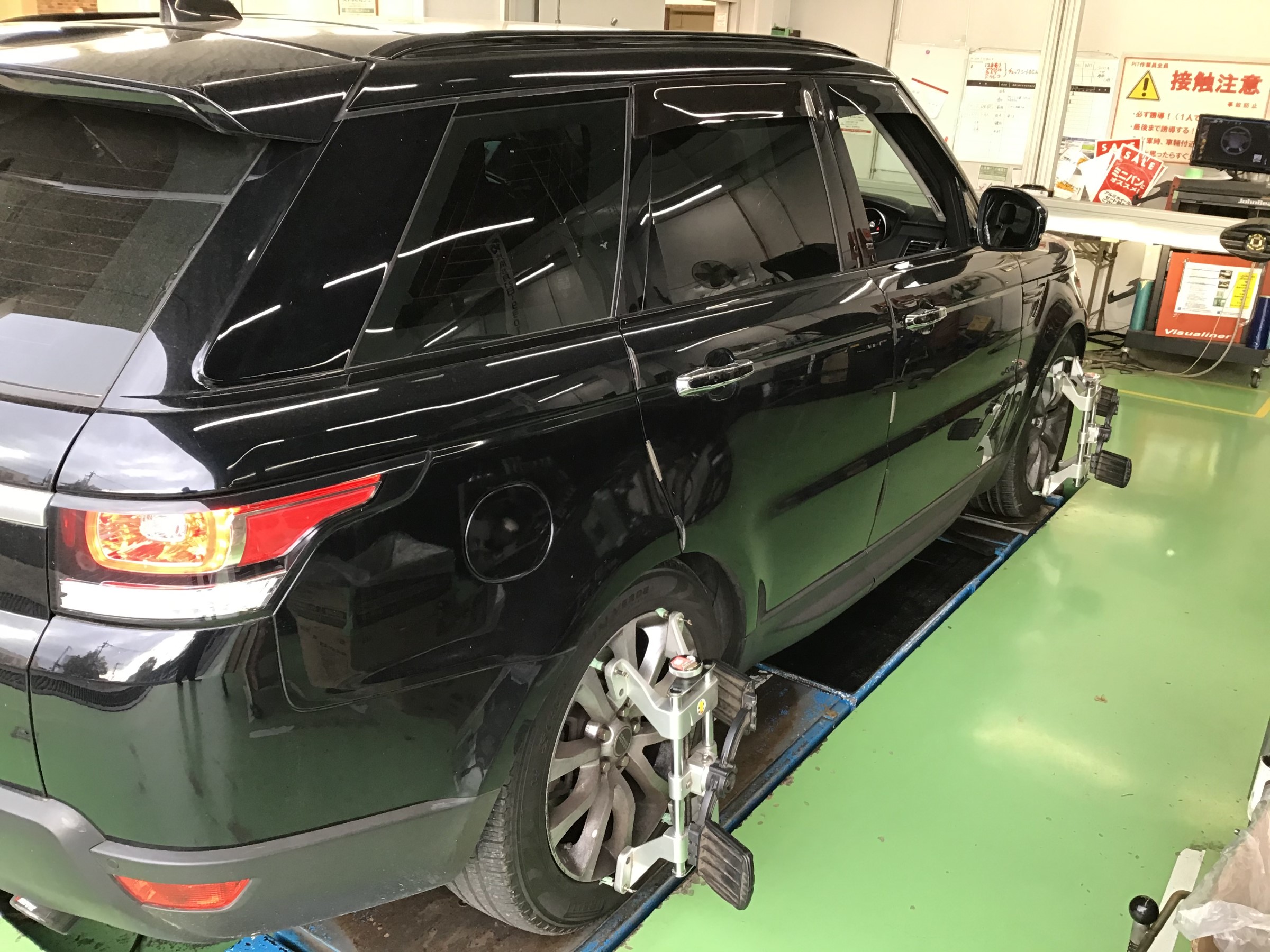 こんにちは。先日、レンジローバースポーツのアライメント調整をさせていただきました。オーナー様が言うには、ハンドルが真っ直ぐの状態も直進性が悪いとのことです。