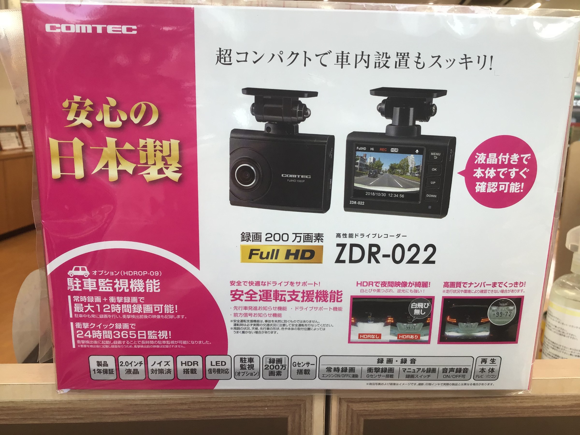 日本製モデルなんです。ドライブレコーダーお考えのお客様、お気軽にスタッフまでお伺いくださいませ