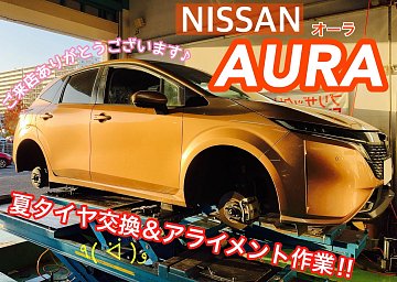 みなさまこんにちは( ・◡・ )♫ 本日は、【ニッサン/オーラ】の夏タイヤ交換&アライメント作業です(*・∀・)ノ いまの季節は、冬用のスタッドレスタイヤのお話が多くなりますが、「スタッドレスタイヤは必要ないよ?」というお客様! 夏用タイヤの新品交換もじゃんじゃん承っております(o・∀・)b゙ ぜひお気...