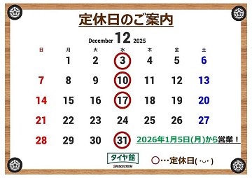みなさまこんにちは( ・◡・ )♫ タイヤ館成田のホームページをご覧いただき、ありがとうございます♪ 3日(水)は、定休日となります。 ご利用のお客様にはご不便をお掛けすることとなりますが、 何卒ご理解、ご了承の程、よろしくお願い申し上げます。 また、営業時間外でも作業予約が可能!! 便利なWEB...