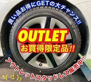 みなさまこんにちは( ・◡・ )♫ 当店では【タイヤアウトレットセール】を開催中!! 現在は、夏タイヤに加えて【スタッドレスタイヤ】のアウトレット商品も多数ご用意しております(o・∀・)b゙ アウトレット品は、現品限り!お値打ち価格でご案内中です+.゚(´▽`人)゚+.゚ 性能はそのままにお値段お得にGETの大...