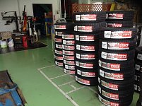 タイヤの陳列を揃える吉住主任! より見やすく! お待ちしております!