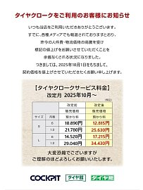いつもタイヤ館成田をご利用頂き、誠にありがとうございます。 すでに、各種メディアでも報道されていますとおり、昨今の人件費・物流価格の高騰を受け、 「タイヤクロークサービス料金」の値上げをお願いさせていただくことを余儀なくされる状況になりました。 つきましては、2025年10月1日をもち...