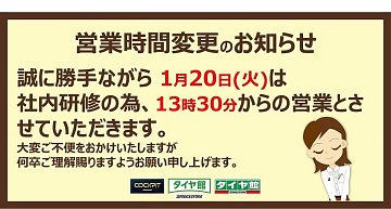 みなさまこんにちは( ・◡・ )♫ 本日も朝から多くのご来店をありがとうございます♪ 本年も【2026年新春☆初売り】は、ロングランで実施しております!! タイヤ交換をお考え・ご検討中のお客様は、ぜひお気軽にお立ち寄りくださいませ!!d(・∀・○) そして!大切なご案内です。 1月20日(火)は、社内研修のた...