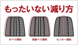 タイヤのもったいない減り方には、へりだけが減る摩耗や、真ん中だけが減る摩耗があります。原因は沢山ありますが中でも多いのが空気圧不足です。メーカーが定めている空気圧をしっかり管理するだけでもタイヤの寿命が伸びる事もあります。また定期的なタイヤのローテーション(位置交換)」も効果があります。