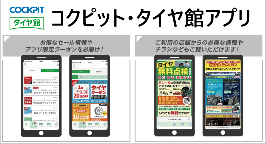タイヤ館アプリをご存じですか?便利な機能満載で、アプリ会員になるとお得な情報をたくさんお届けします!