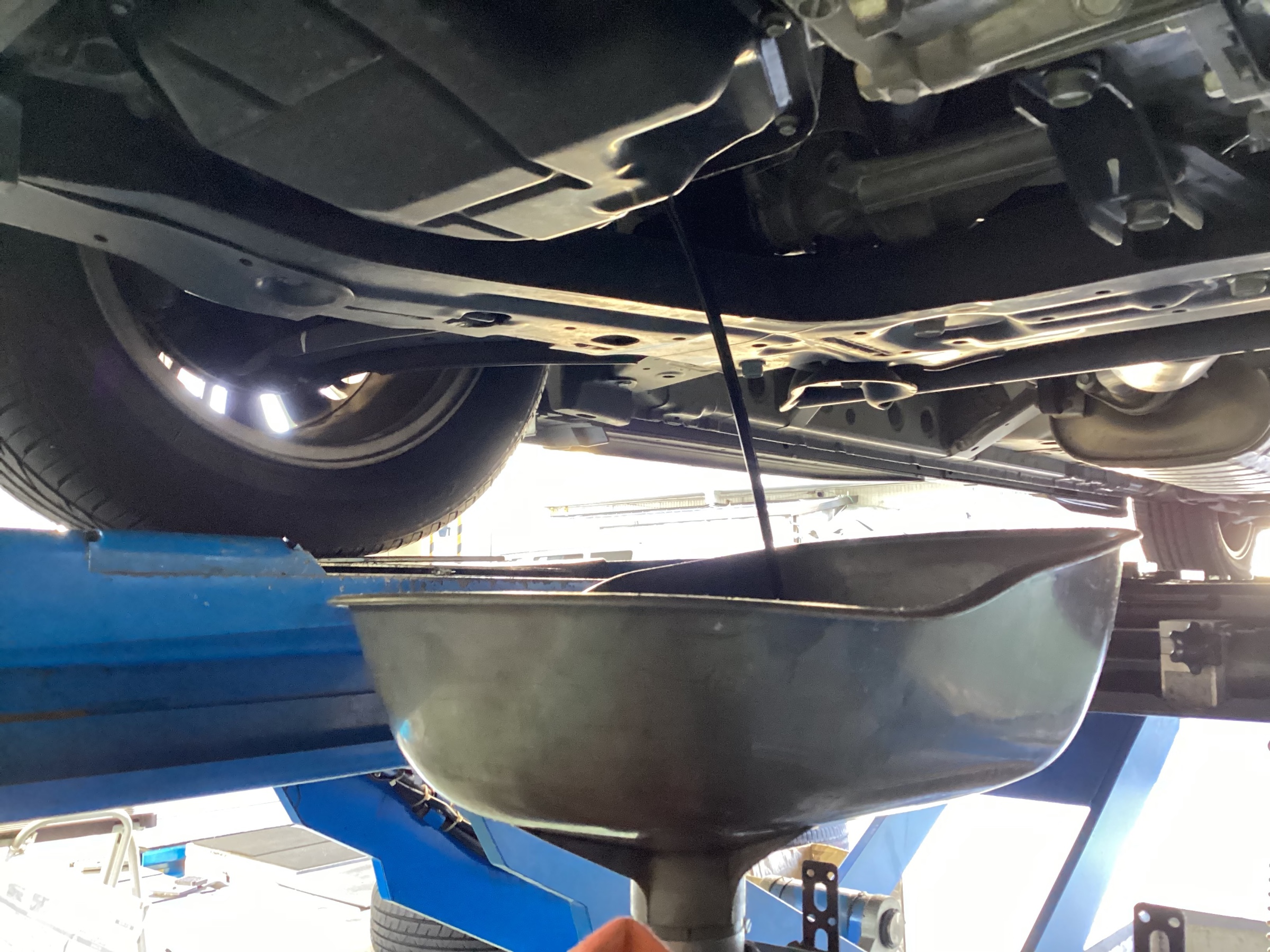 オイル抜き取り中です。交換時期を少し過ぎていて黒く汚れが目立っていました。