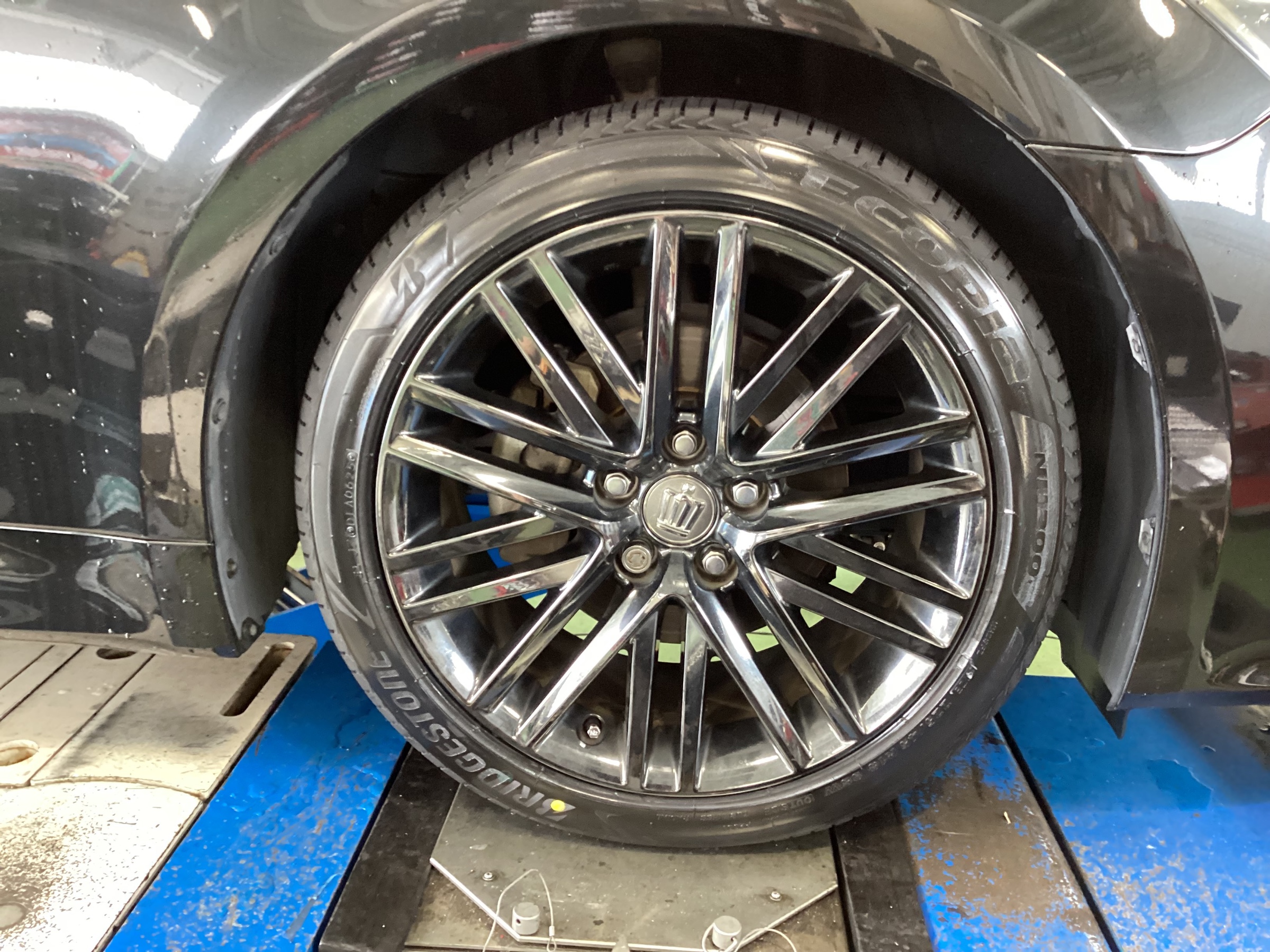 お車のタイヤ・ホイールにセンサーを取り付け、タイヤの取付角度のミリ単位の数値を測ります。