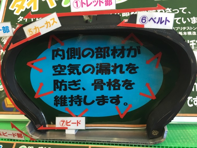 タイヤはゴムだけでなく様々な部材が合わさって、丸いタイヤの形になって内圧を維持しています。