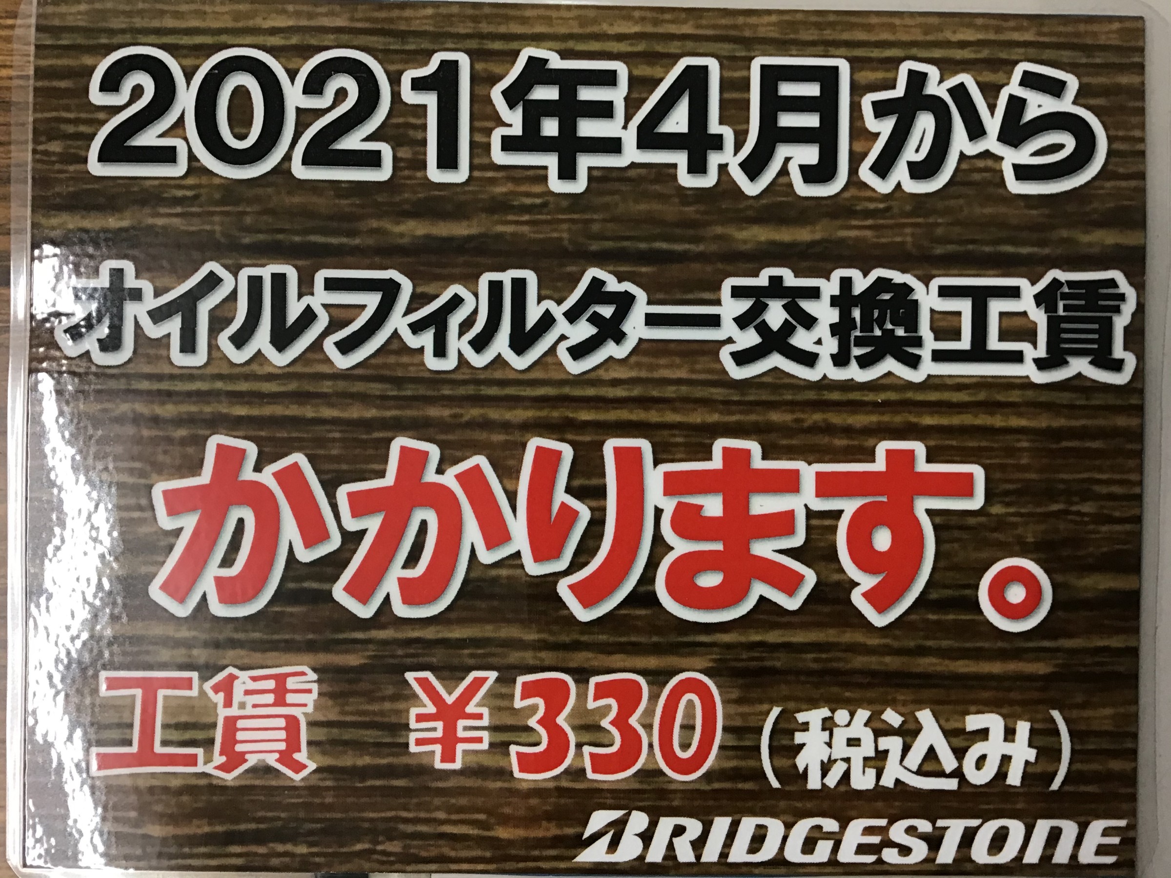 オイルフィルター交換の時に ポスト 2021年4月10日 4月から工賃がかかるようになりました。 オイルフィルターを交換する時の工賃が増えました。 330円かかるようになりました。 宜しくお願いしますm(_ _)m 担当:宇佐美