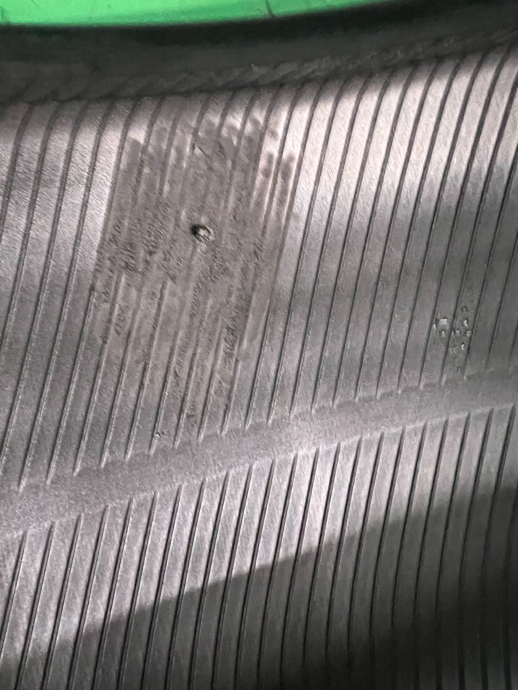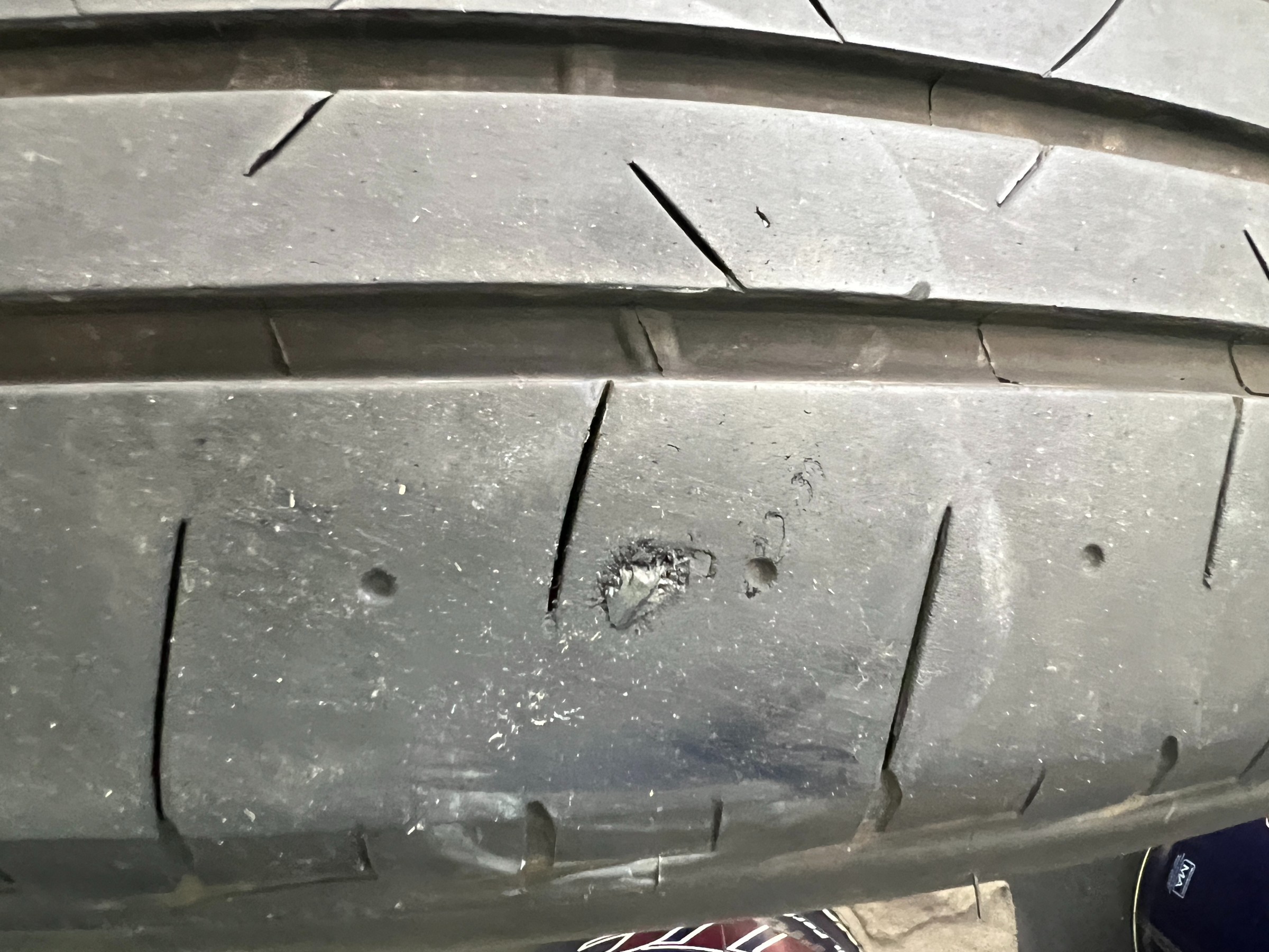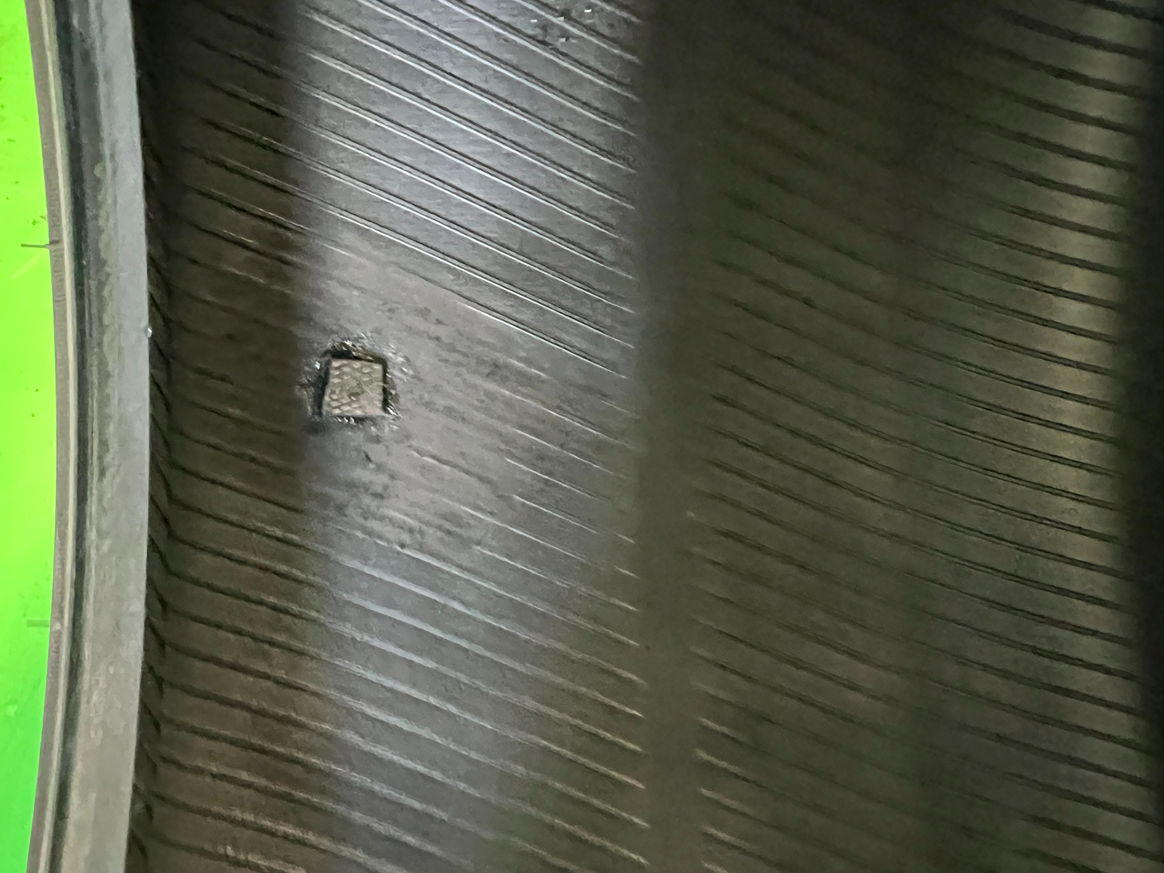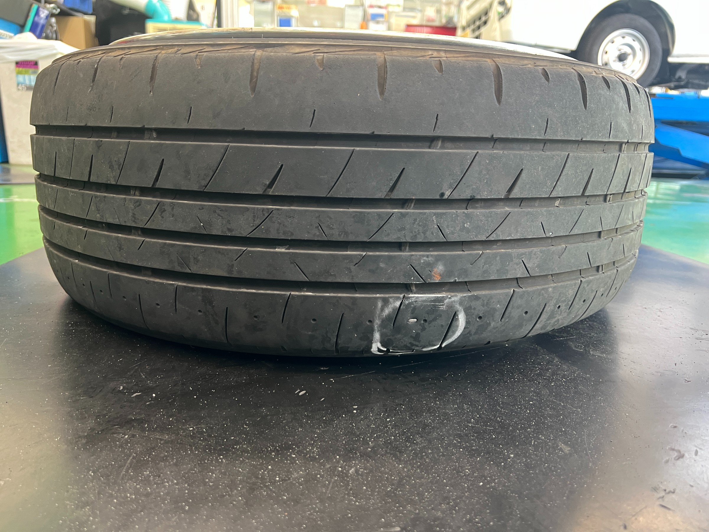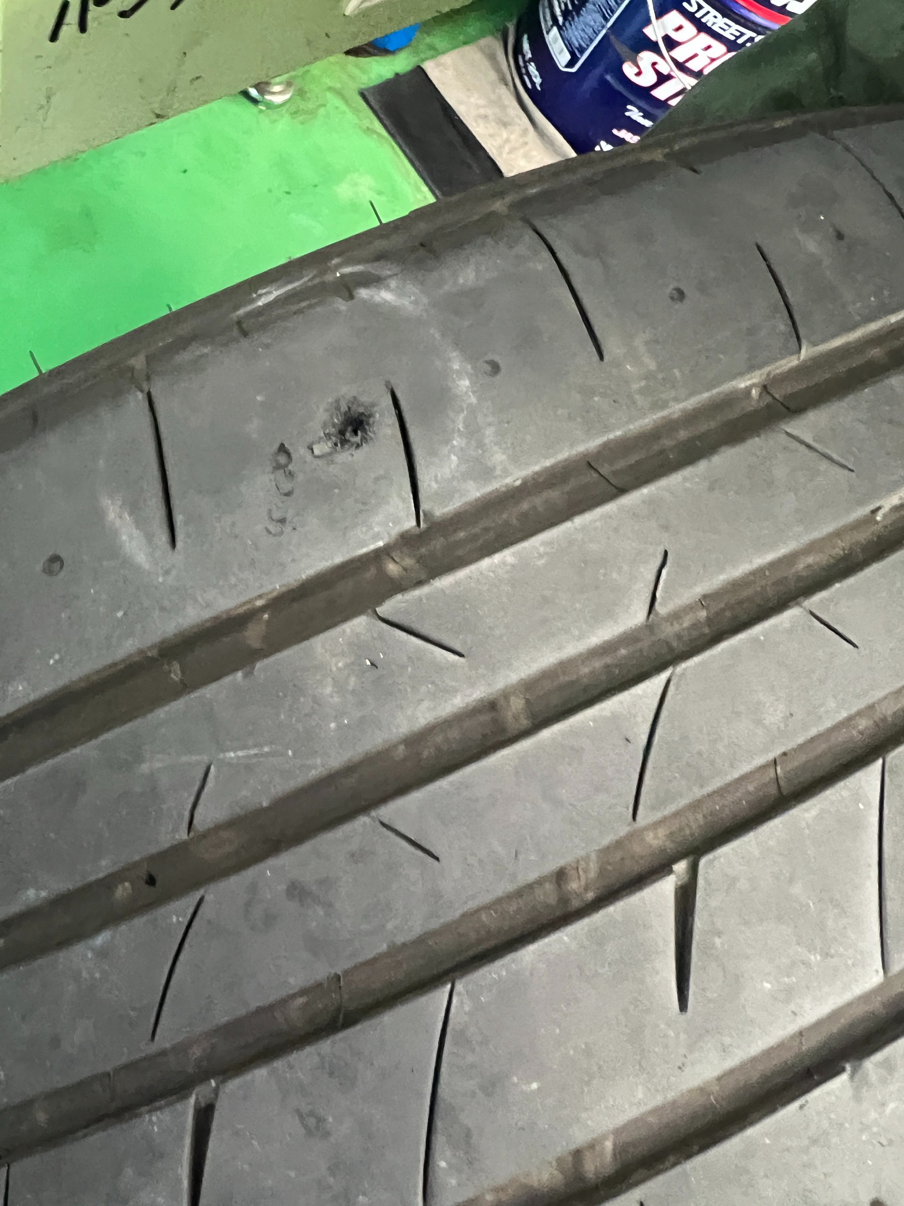 タイヤには鋭利な異物が貫通しており、エア漏れの状態でした。