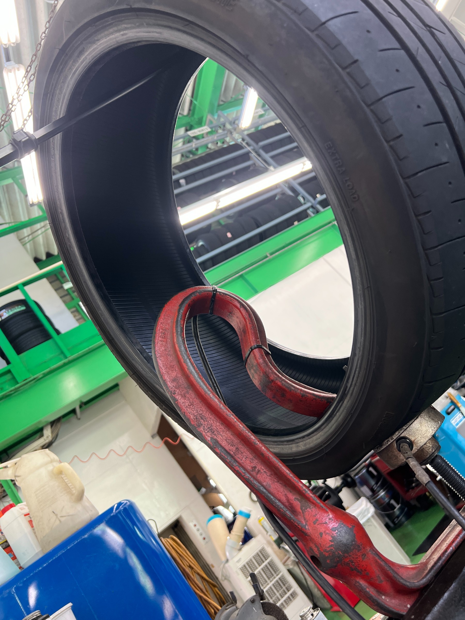今回はタイヤをホイールから取り外し、生ゴムを焼き付けて密着させる内面修理を行いました。