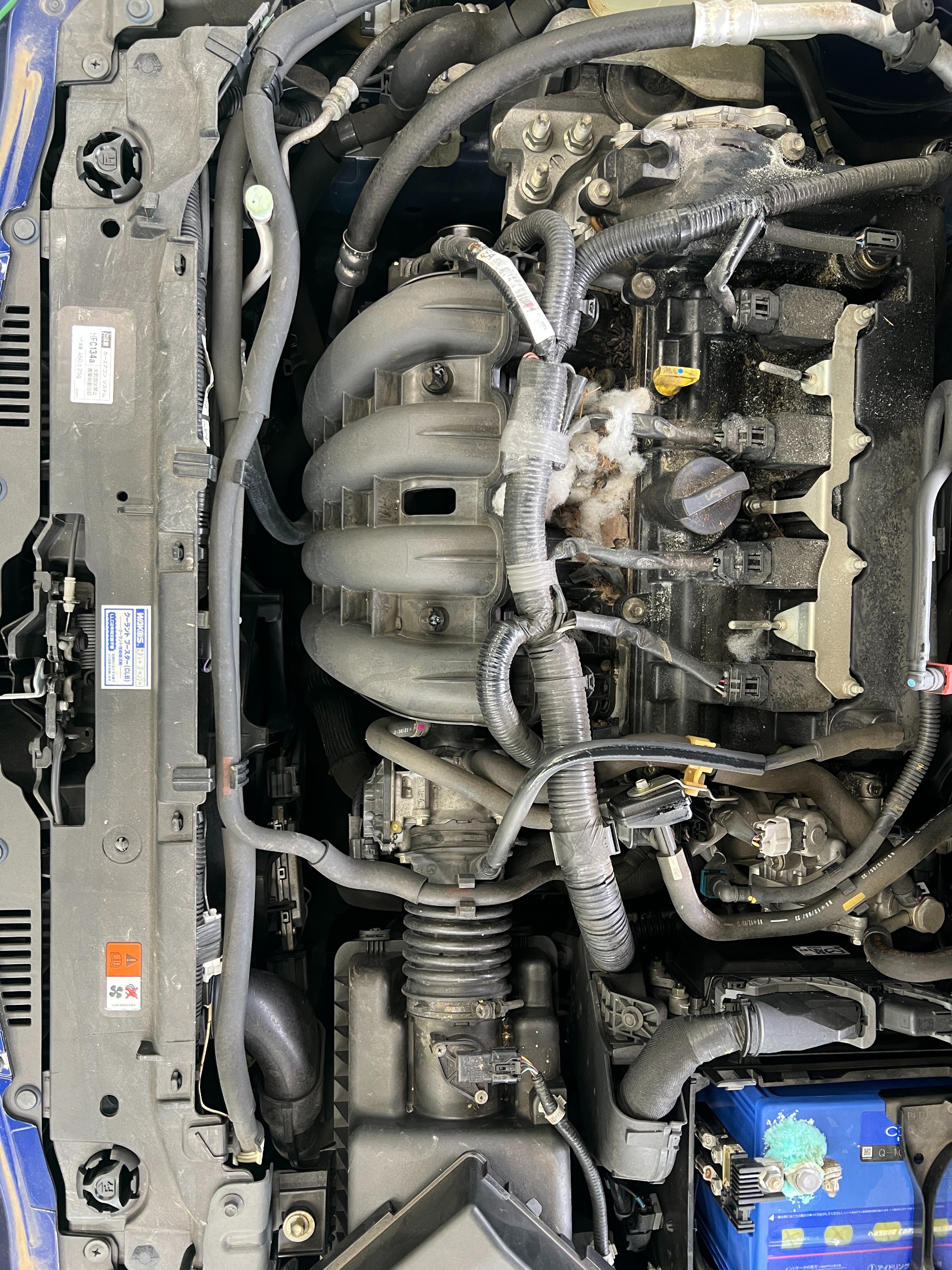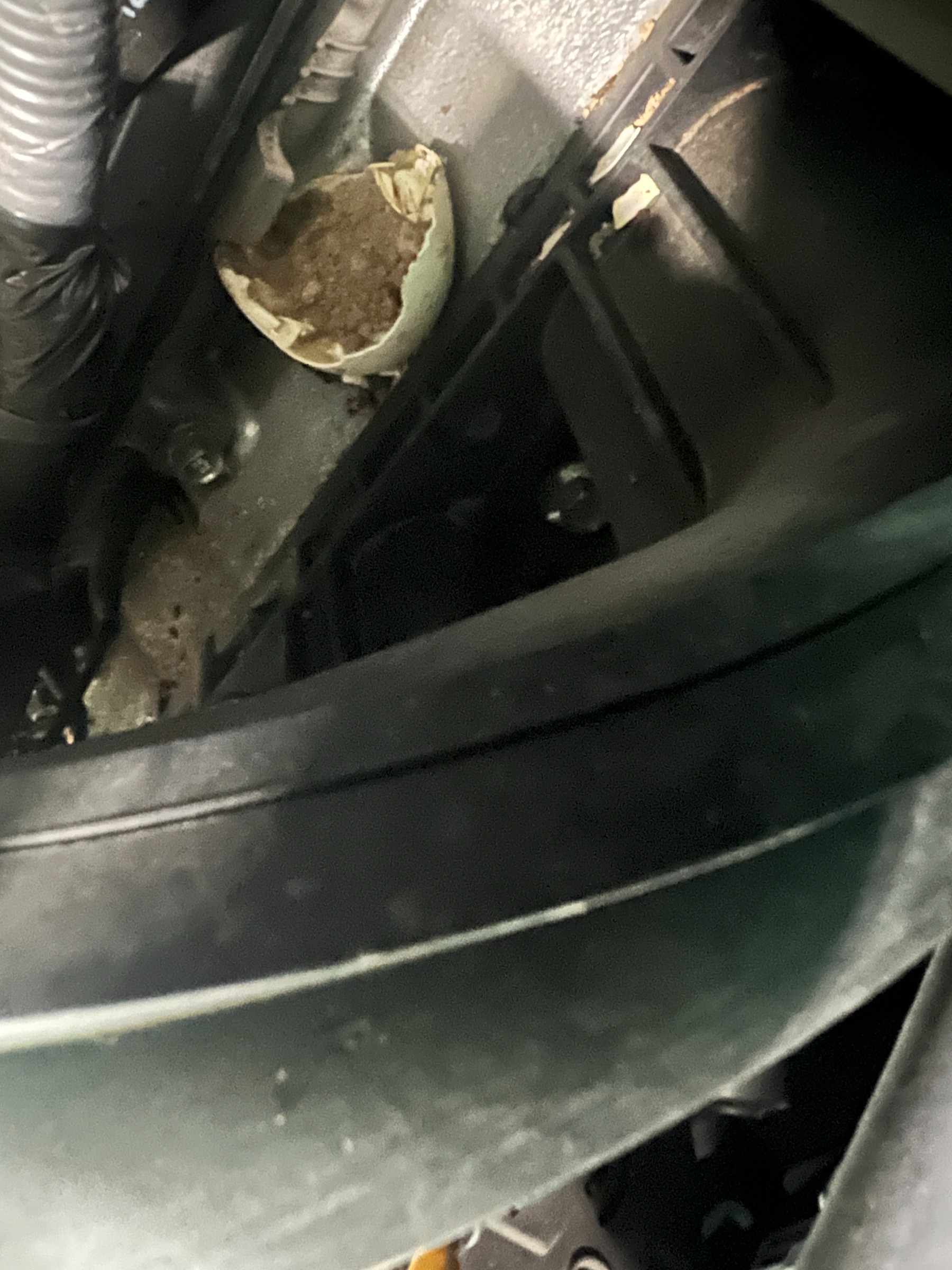点検中、エンジンルーム内に小動物が巣を作った跡を発見。