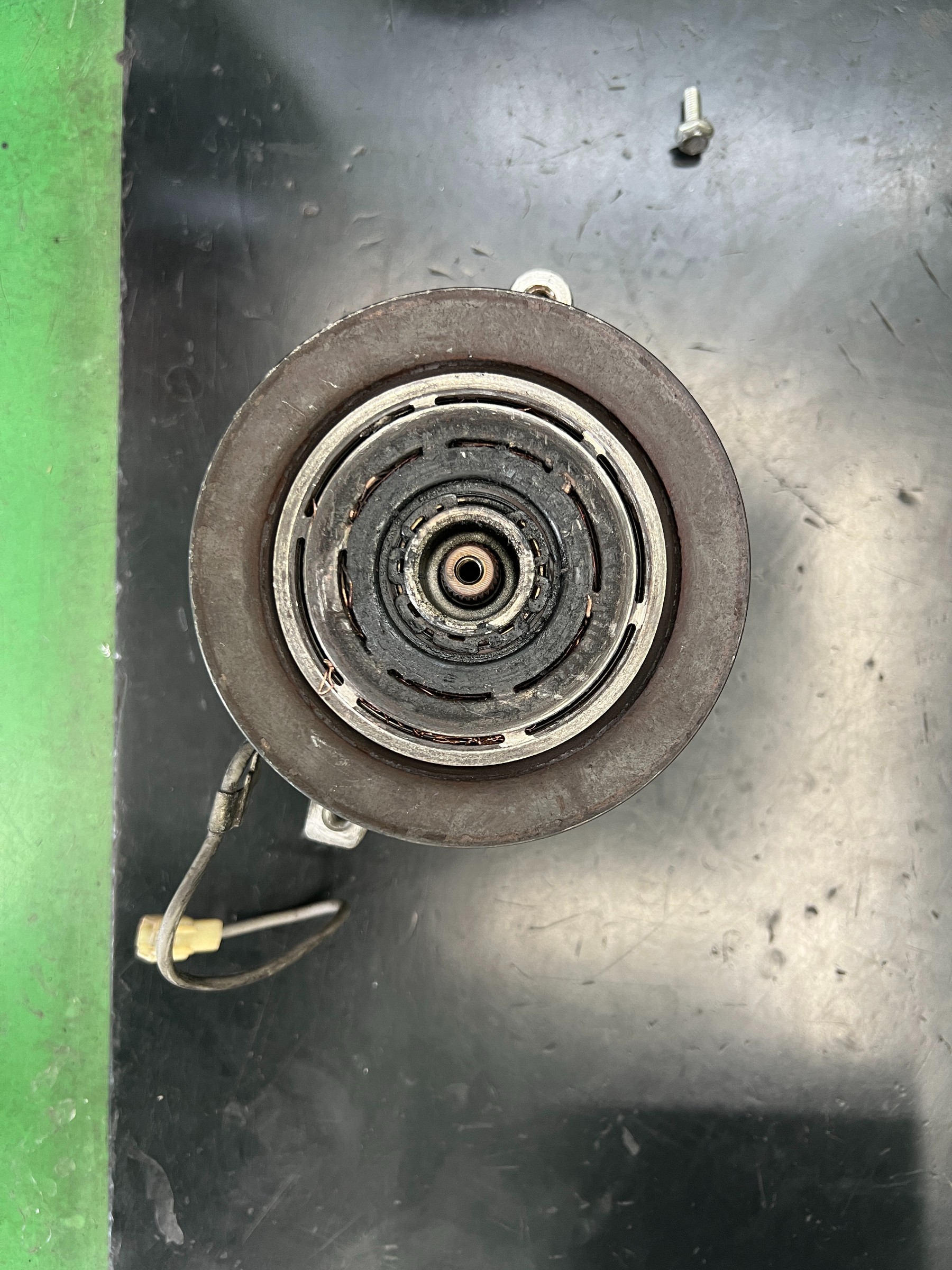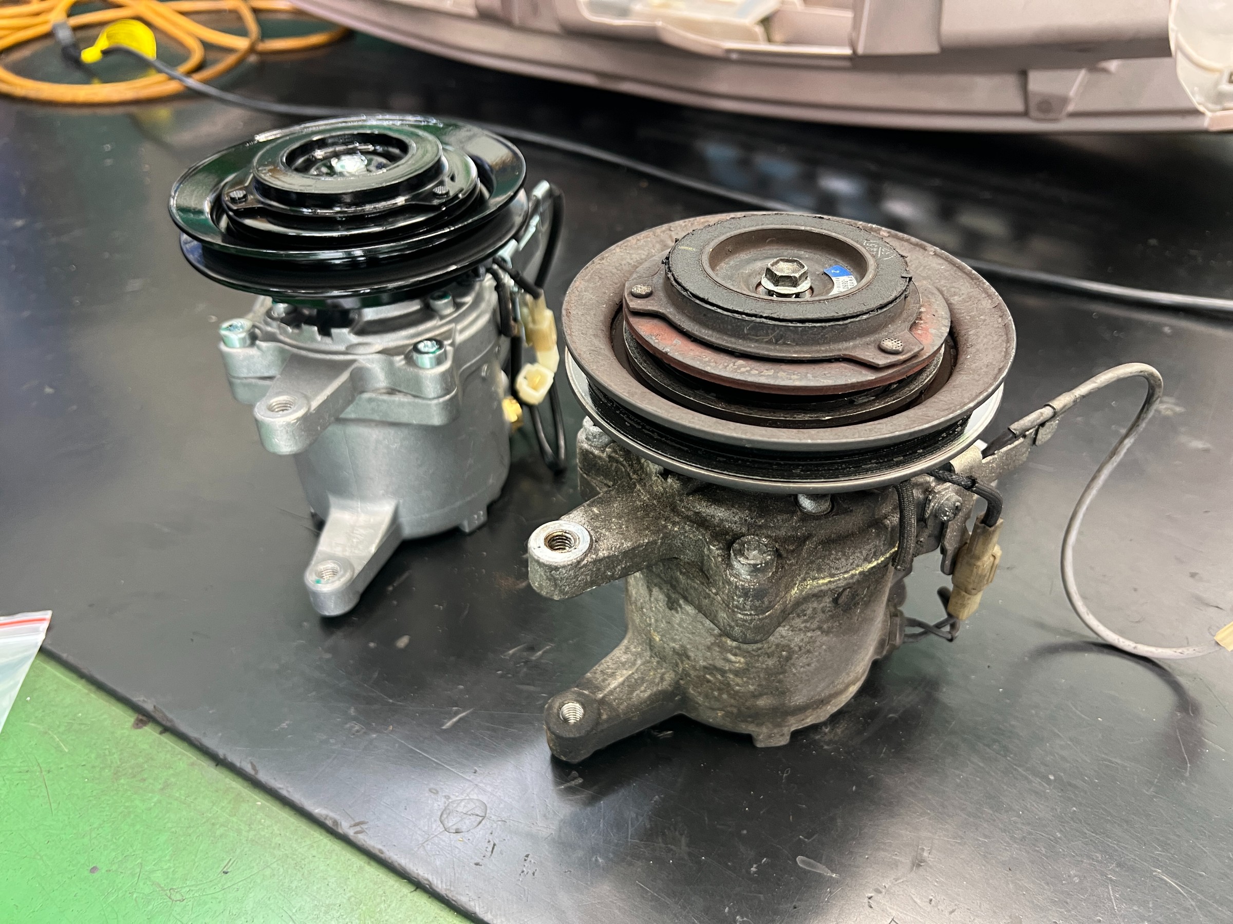 古いコンプレッサーは摩耗やサビ、クラッチ部の劣化が目立ちます。
