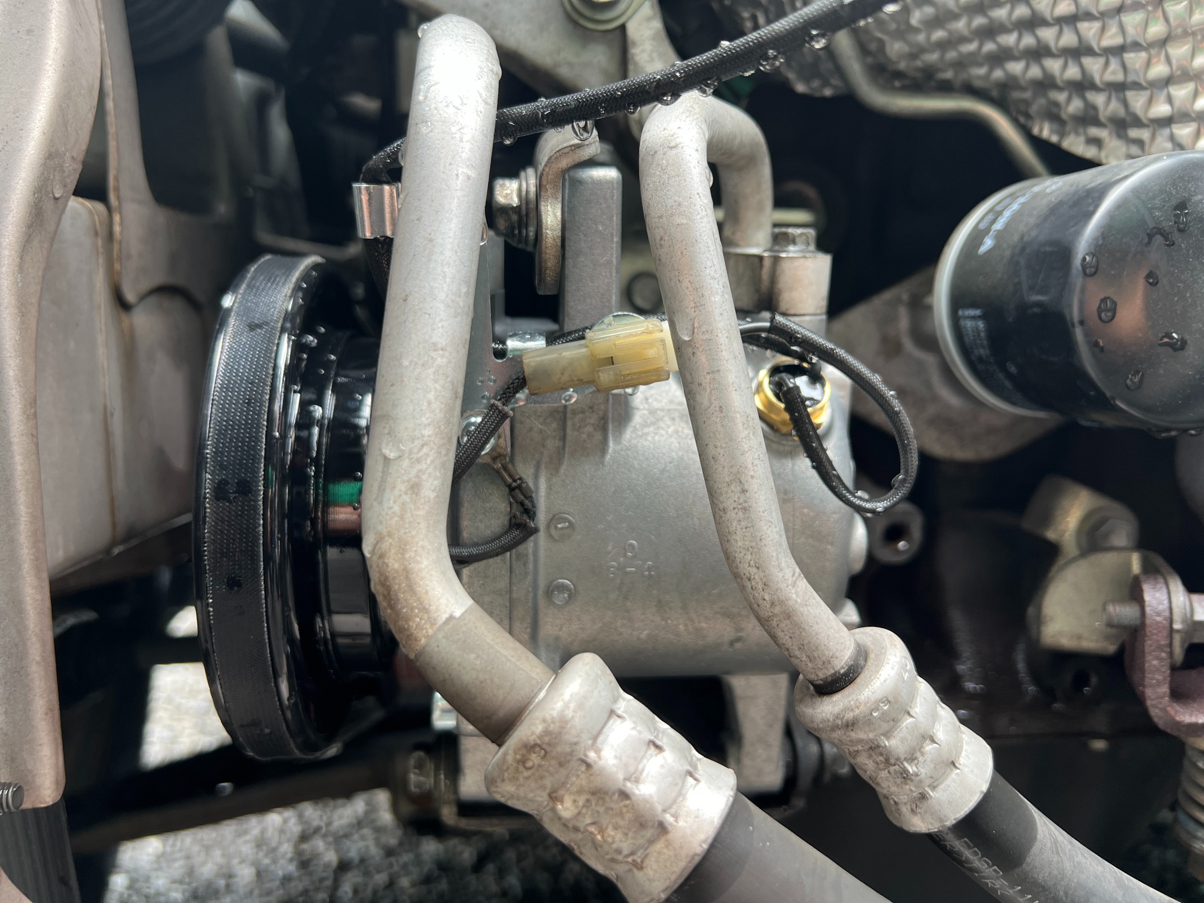 作業はフロントバンパーを外し、故障したコンプレッサーを取り外し。