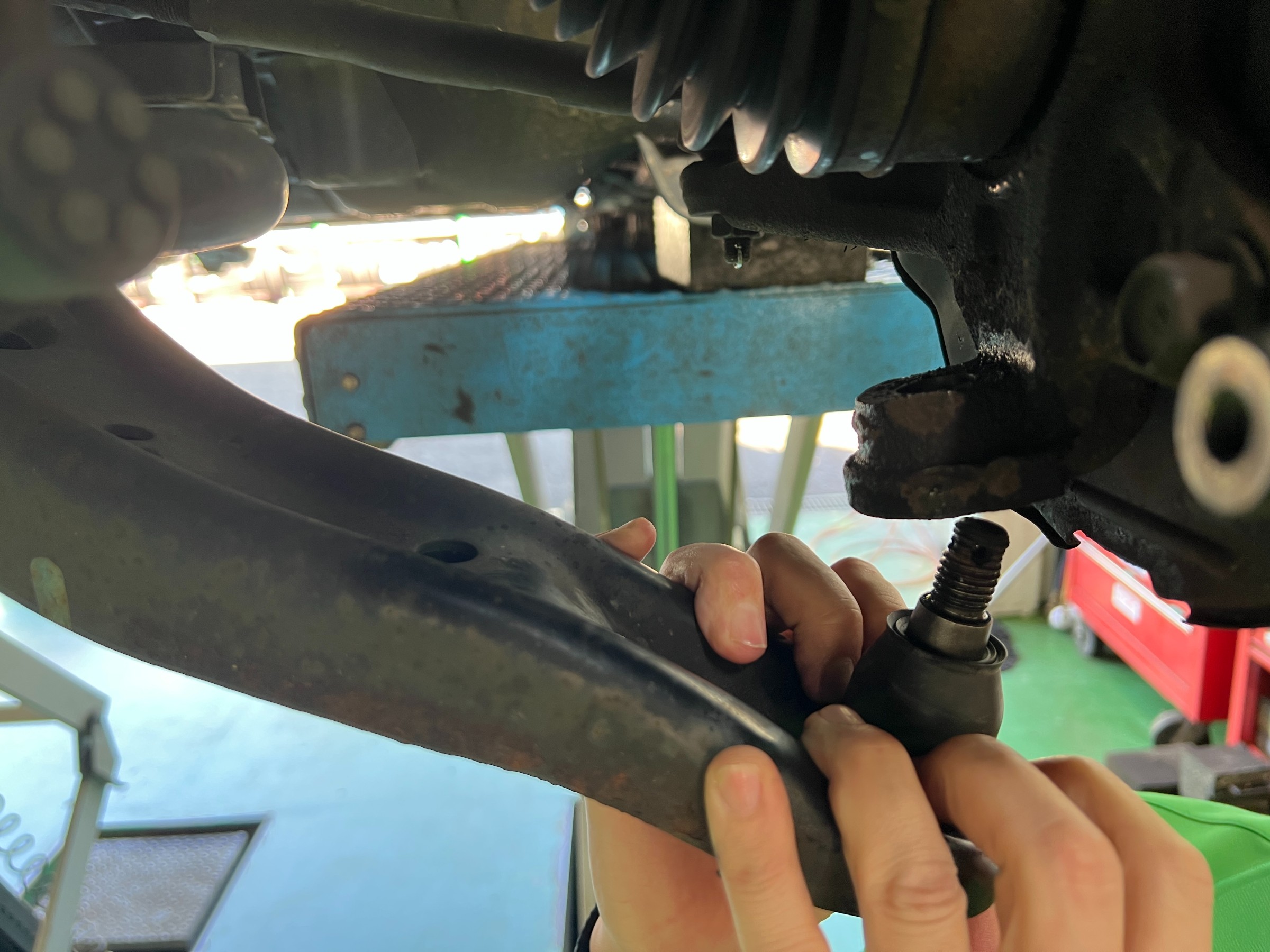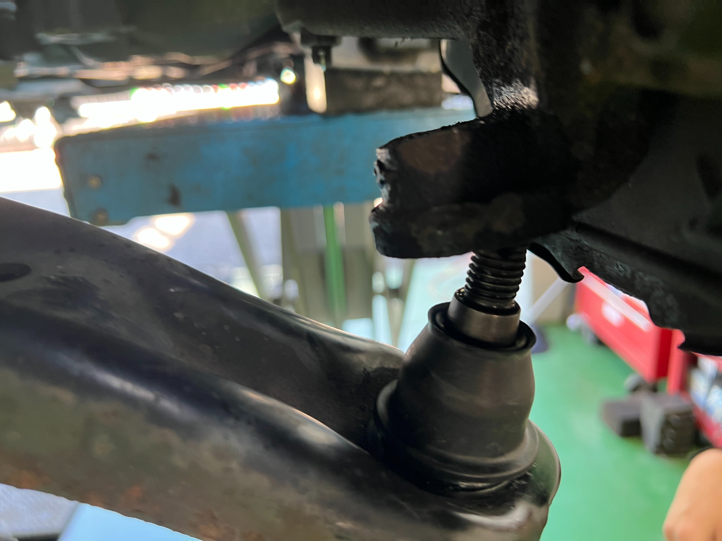 定番ポイント。まず足回りではロアボールジョイントなどのゴムブーツ破れ中のグリスが外へ漏れていたため
