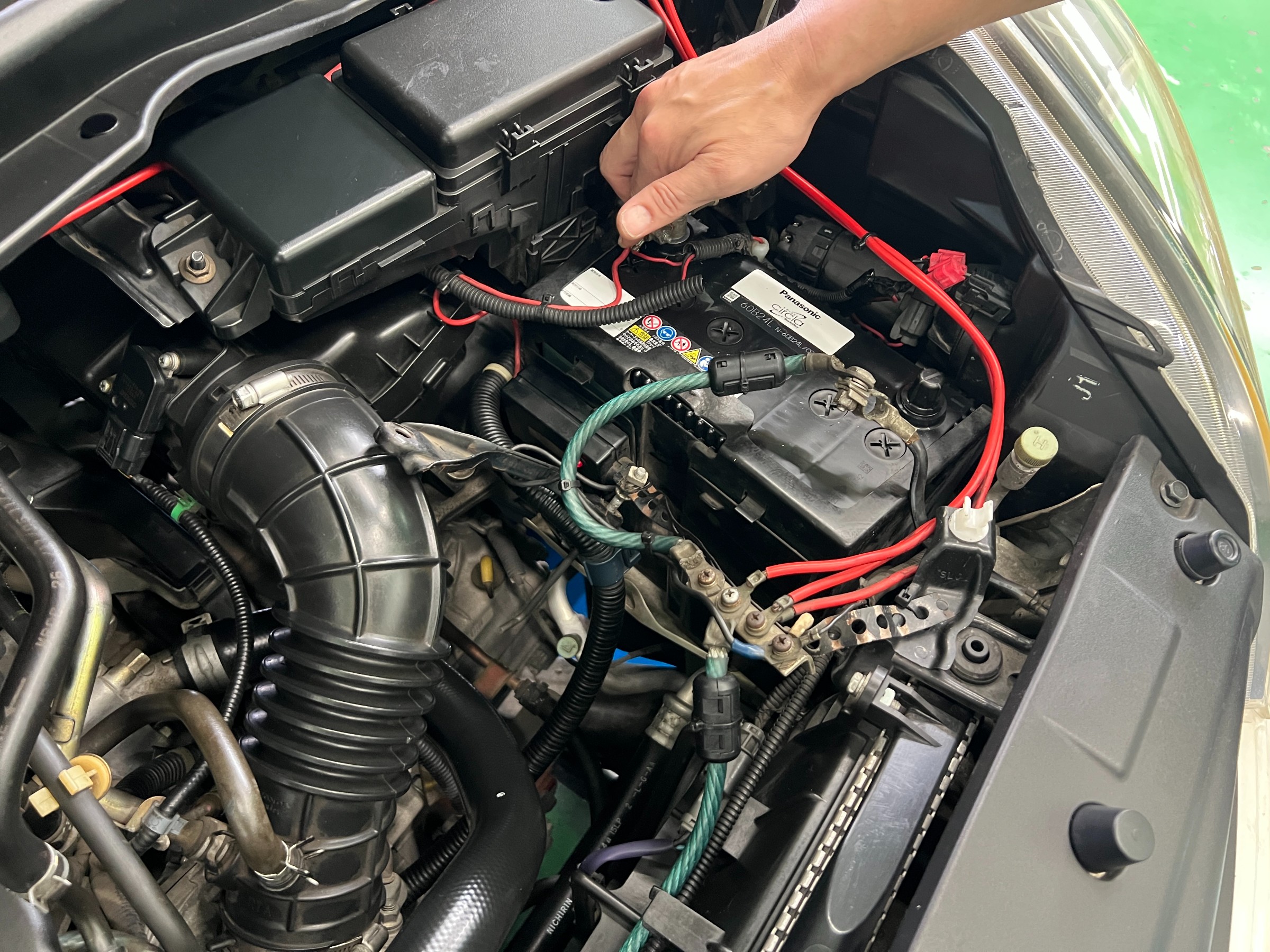 写真の通り、端子周辺の配線やアースポイントも多い車両でしたが、ひとつひとつ丁寧に確認しながら作業を進めました。
