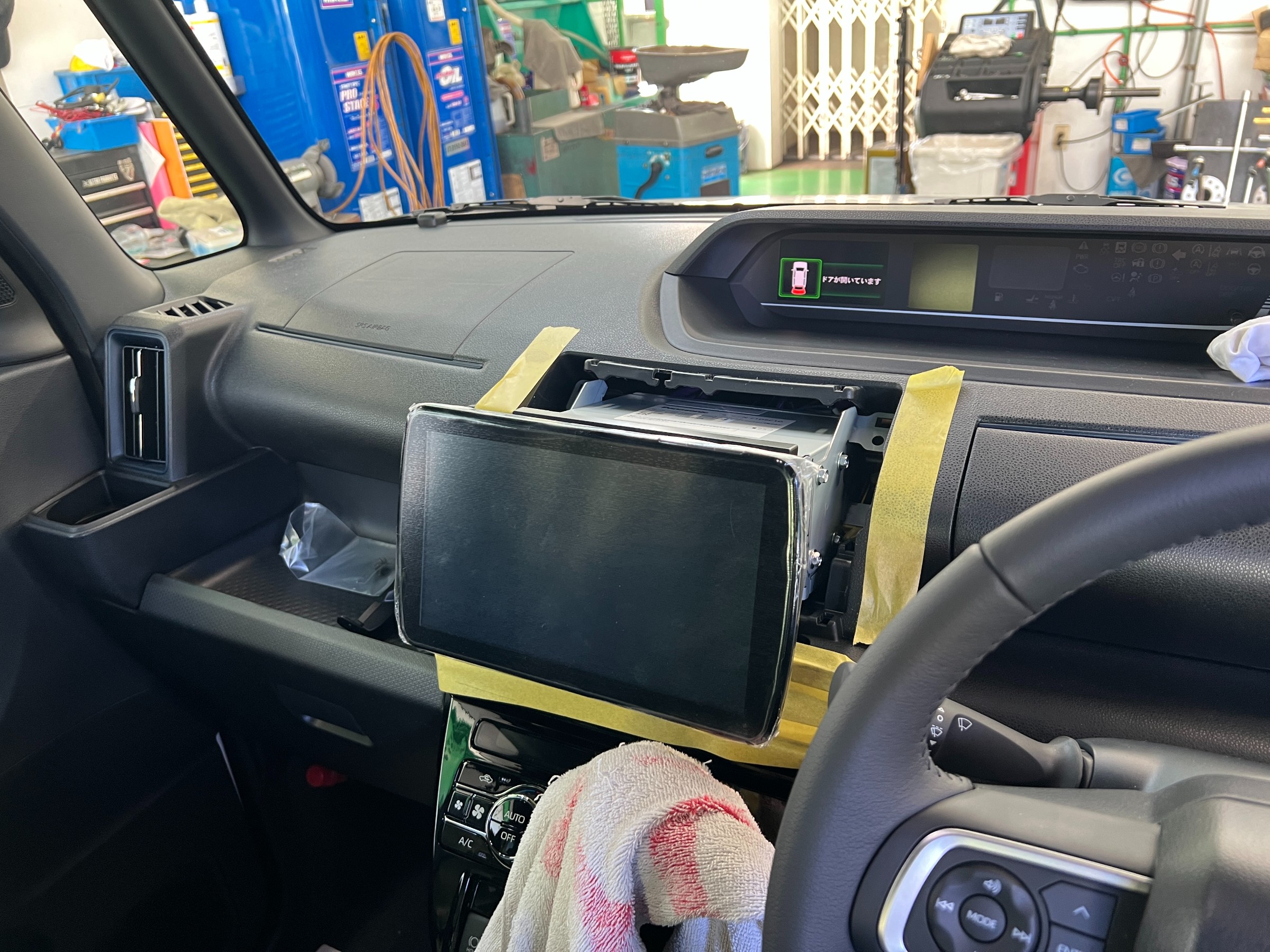 車種専用の取付キットを使用し、内装を傷つけないようしっかり養生して作業を進めています。