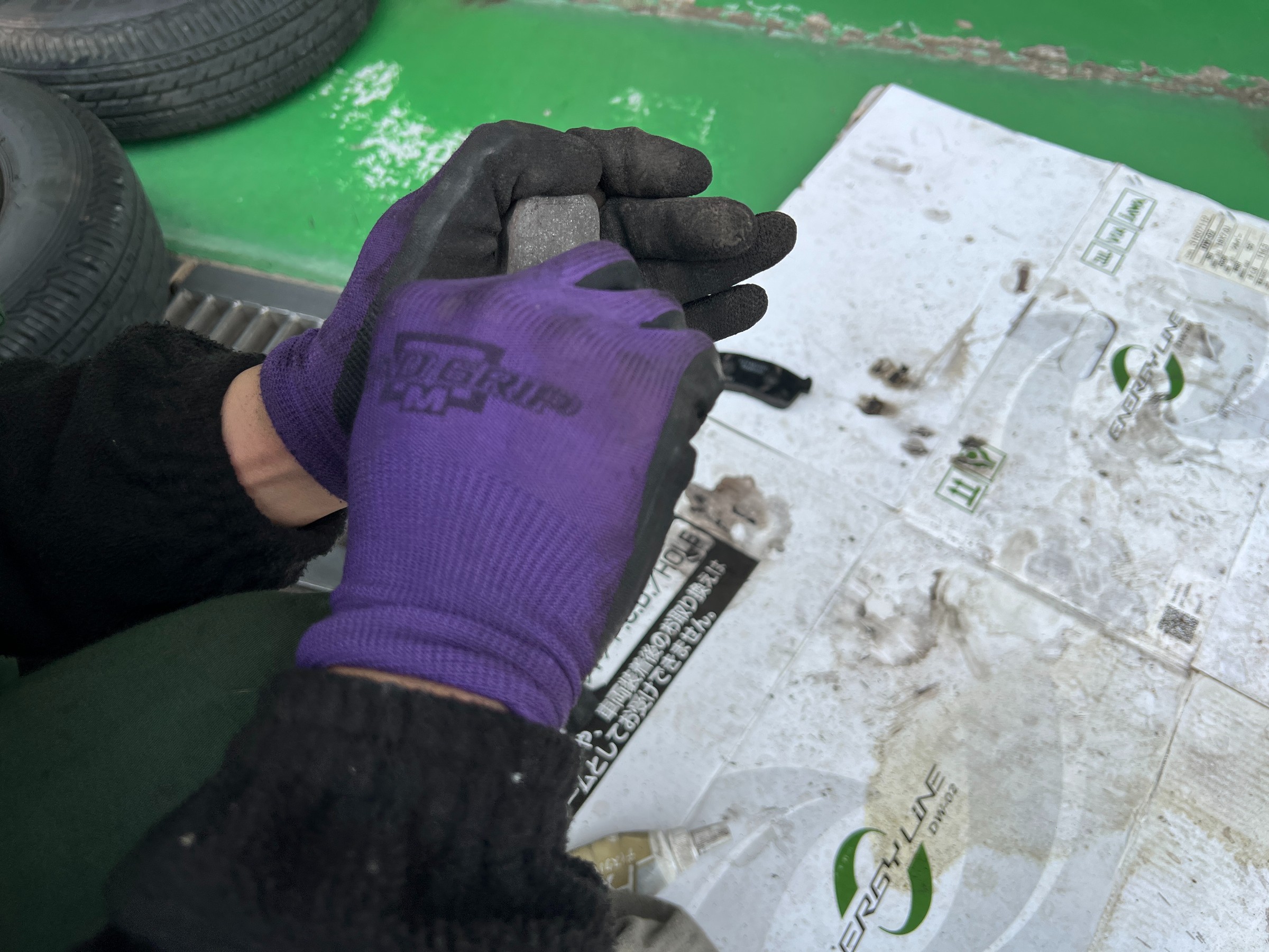 ディスク・キャリパー・パッドの状態を確認すると、残量はまだあり、制動力に問題はない状態でした。ただし、パッドの角や当たり面の状態から、鳴きが出やすい条件がそろっていることが確認できました。