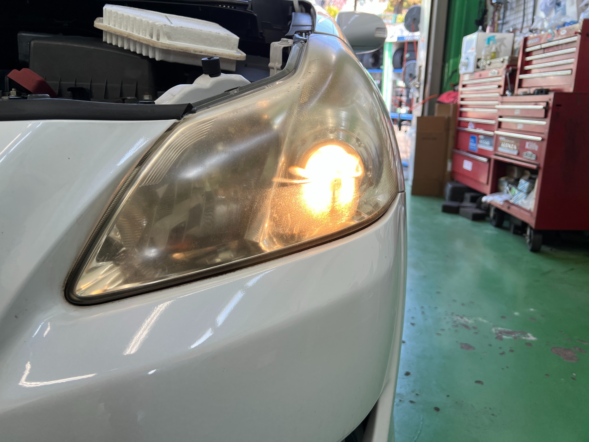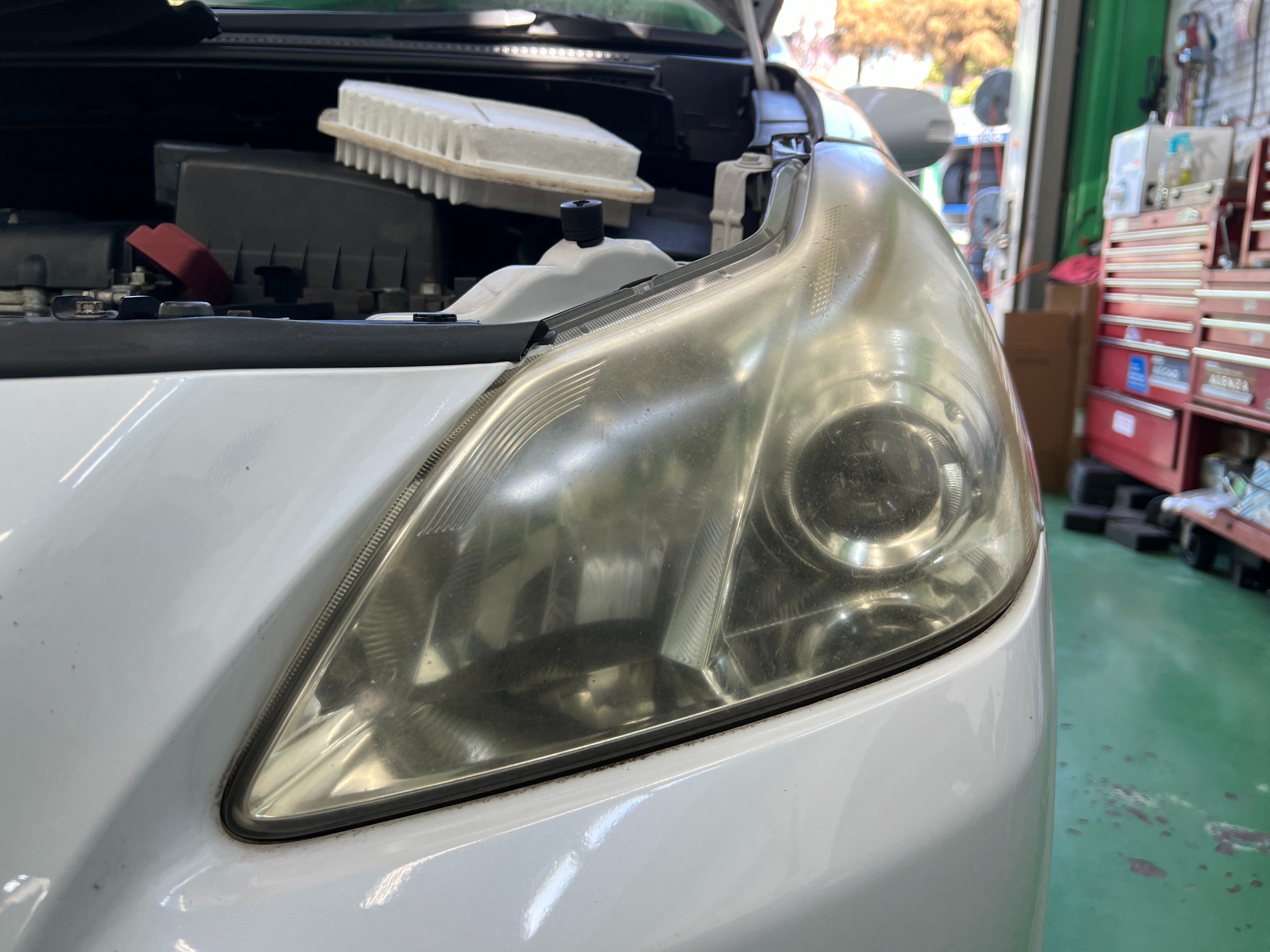 年数の経過によりヘッドライトに曇りが見られ、このままでは光量不足で車検NGとなる可能性がある状態でした。