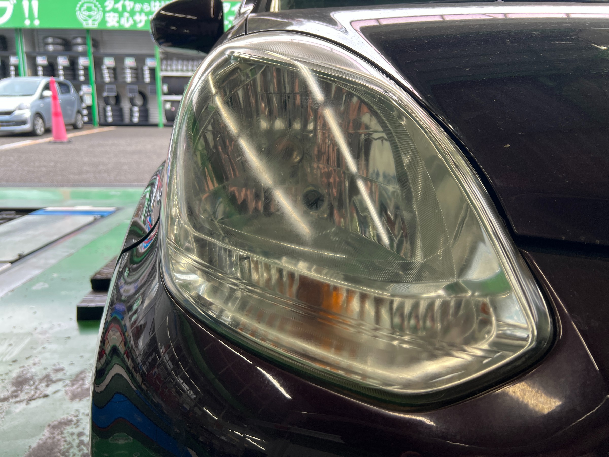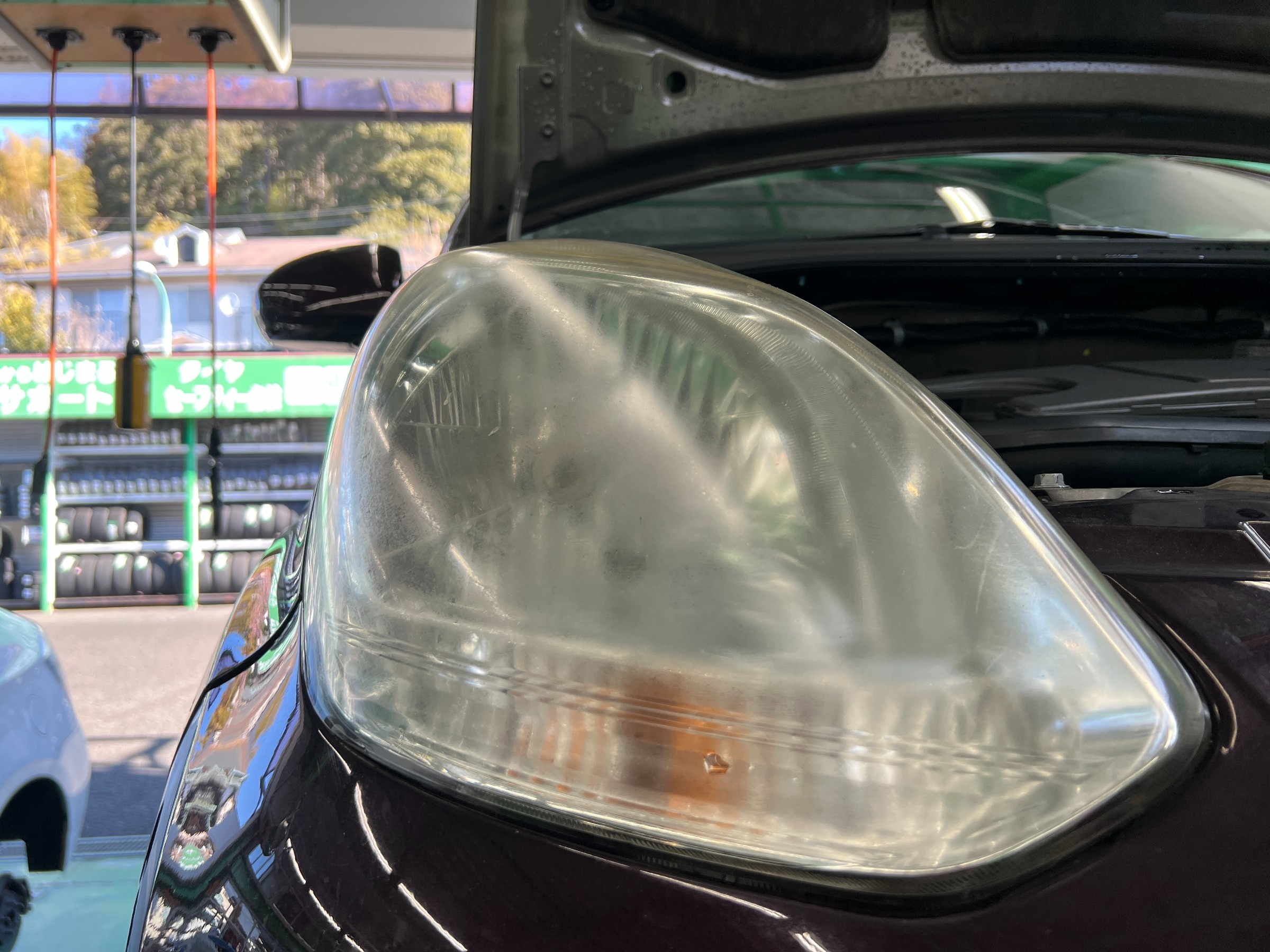 まずは、へッドライトレンズに曇りが見られ、この状態では光量不足により車検不適合となる可能性があります。