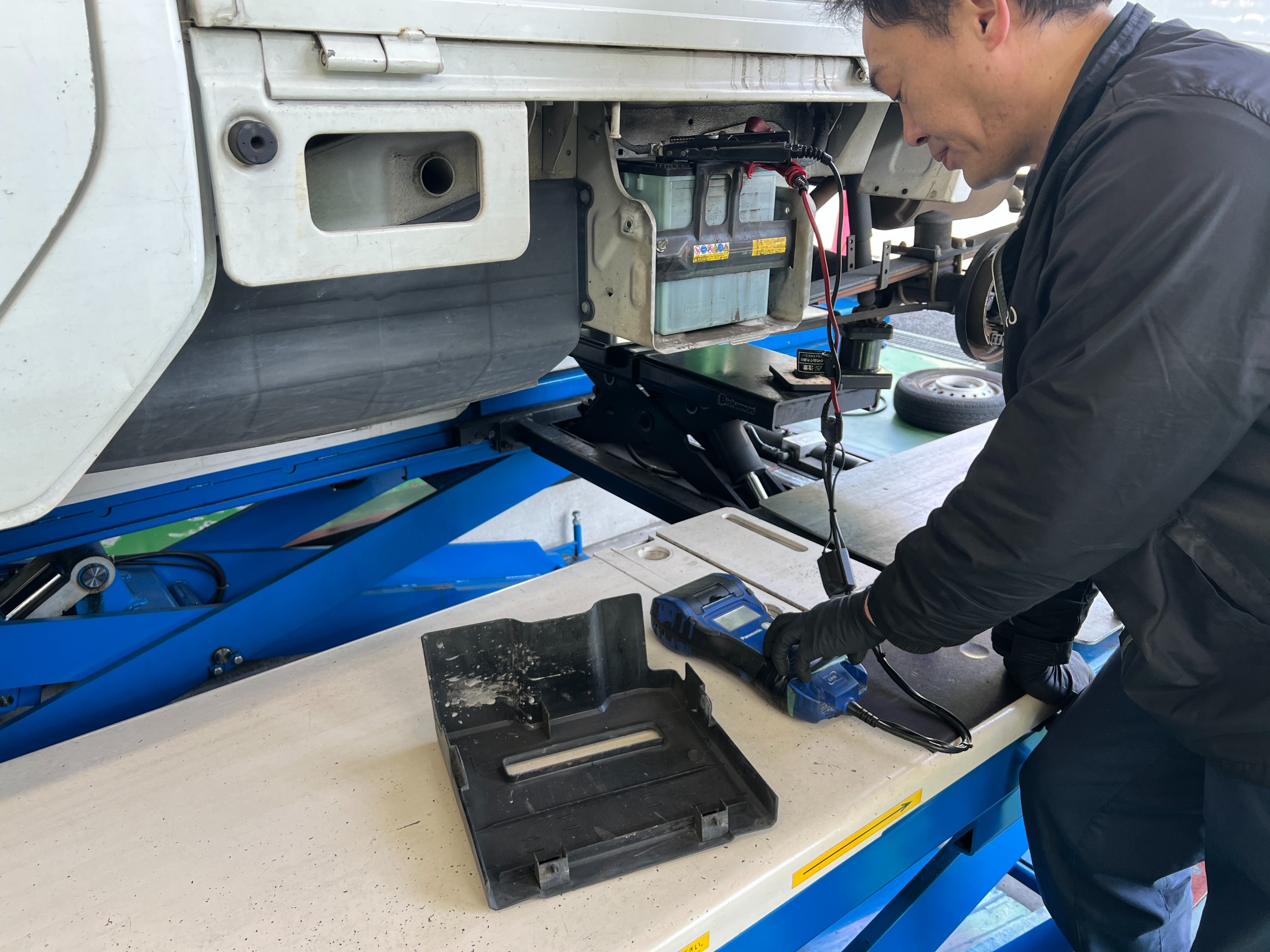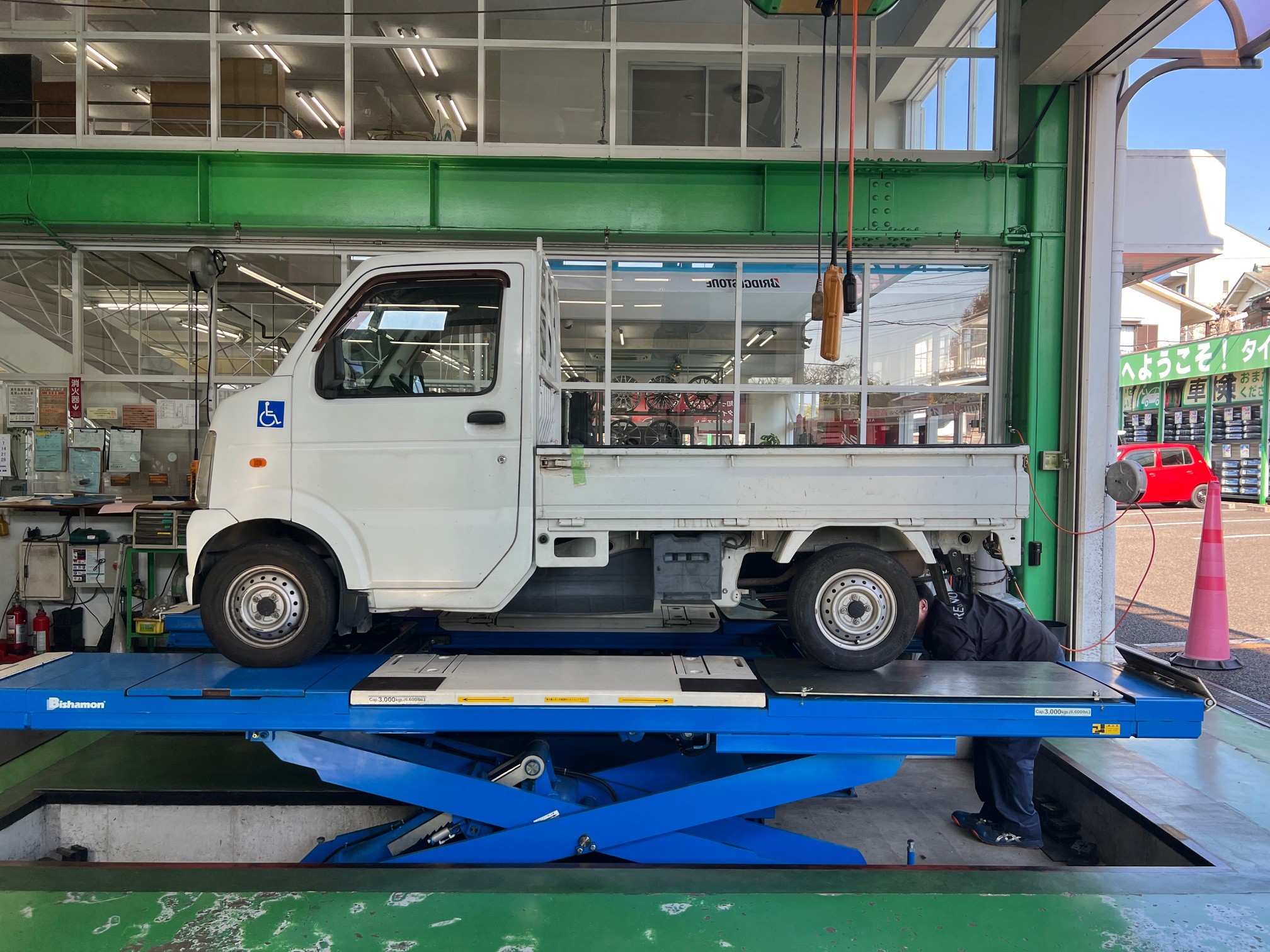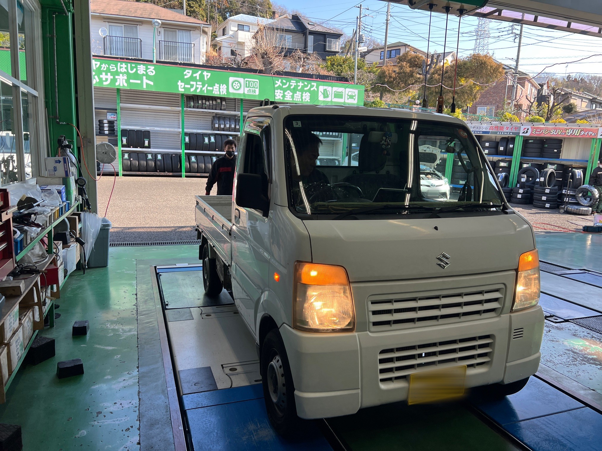 お仕事で使用されている軽トラックということもあり、定期点検でしっかり各部を確認していきます。