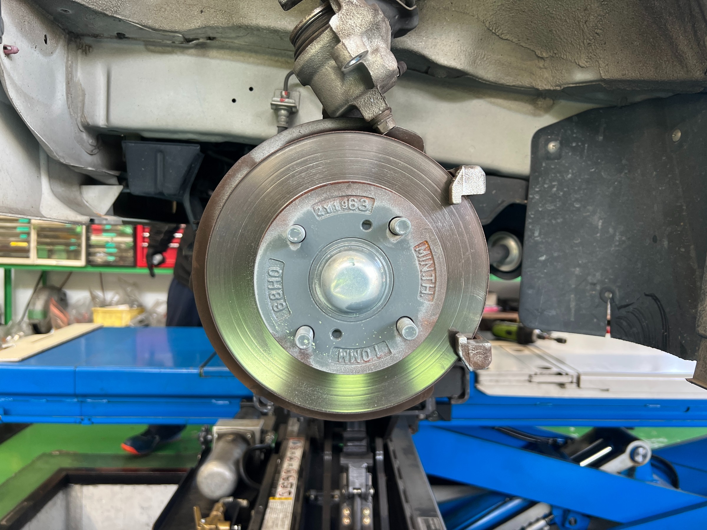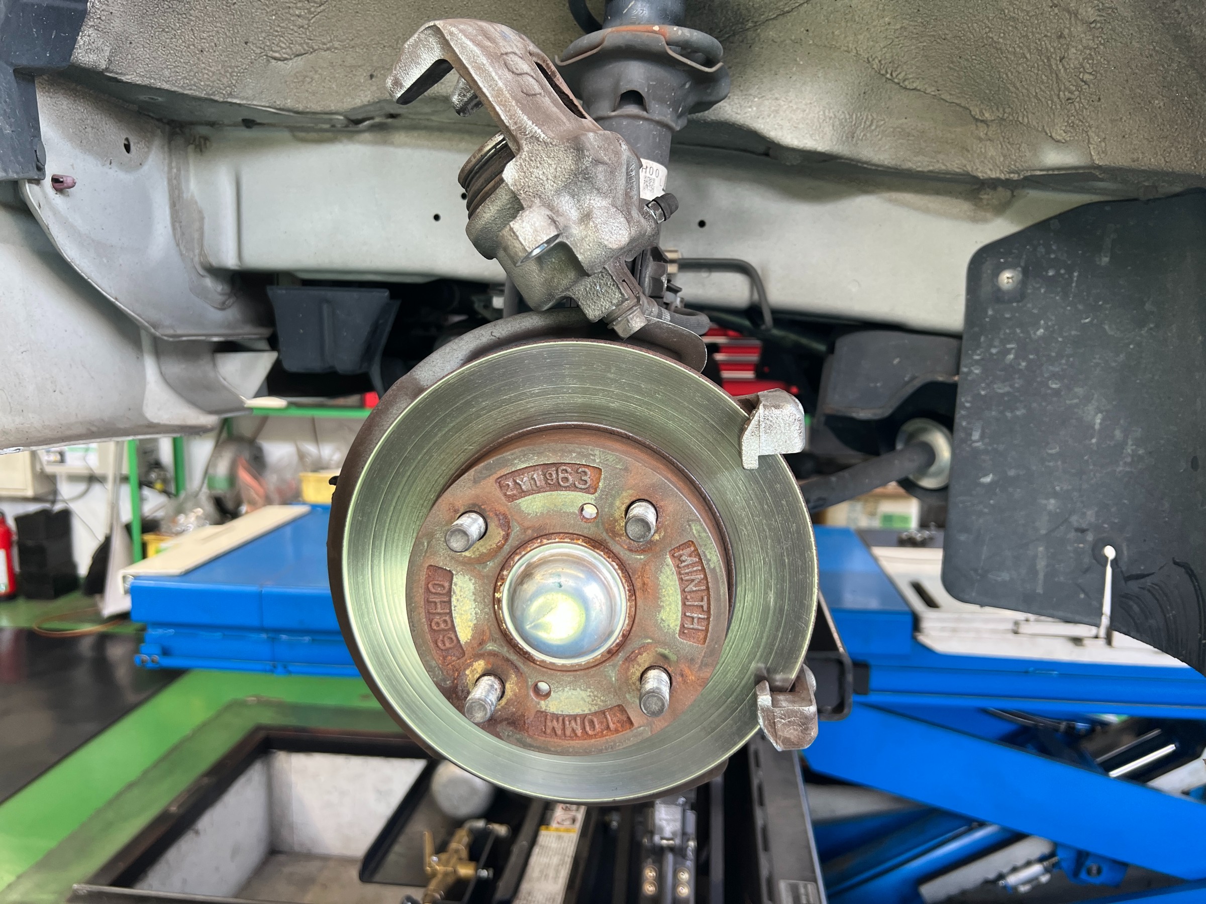 まずはリフトアップして下回り点検。足回り,ブレーキ,サスペンション,下回りの状態などを確認していきます。