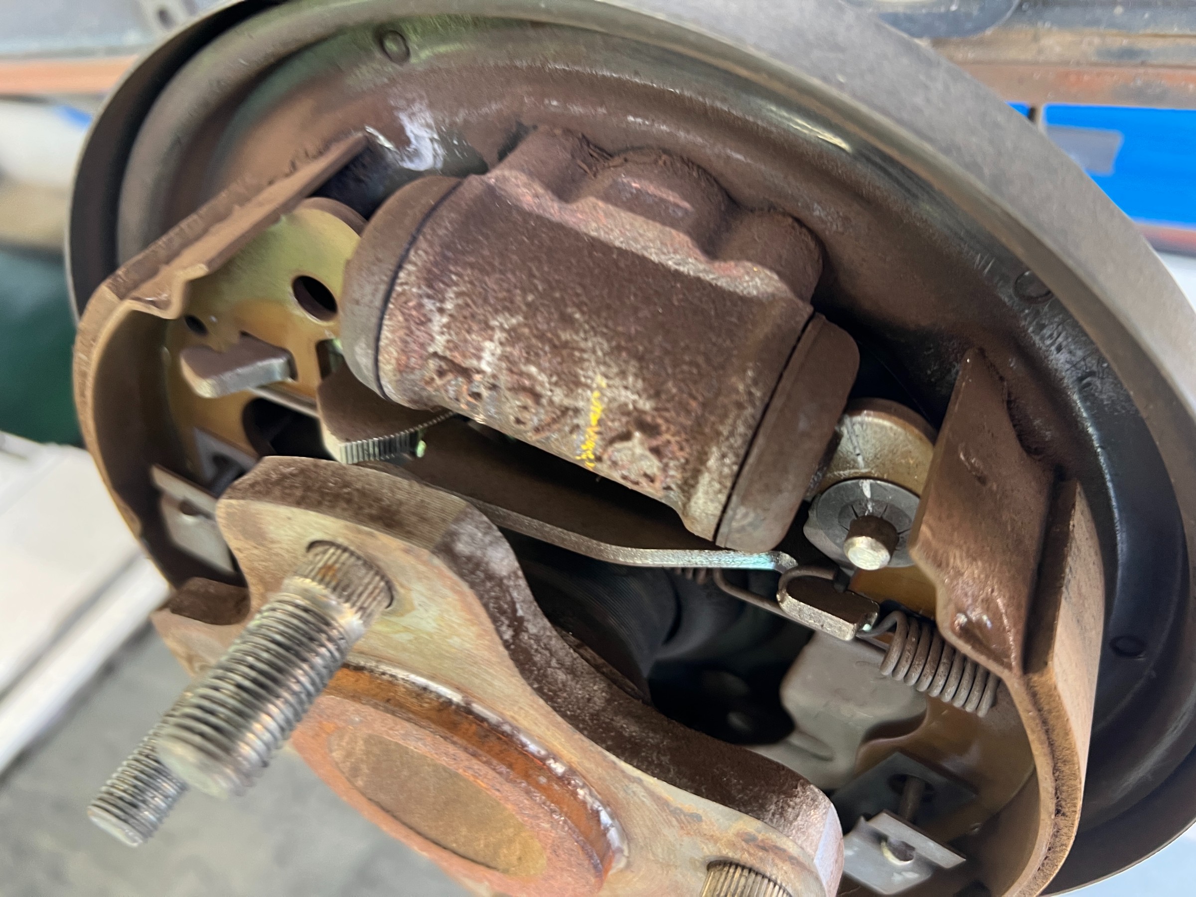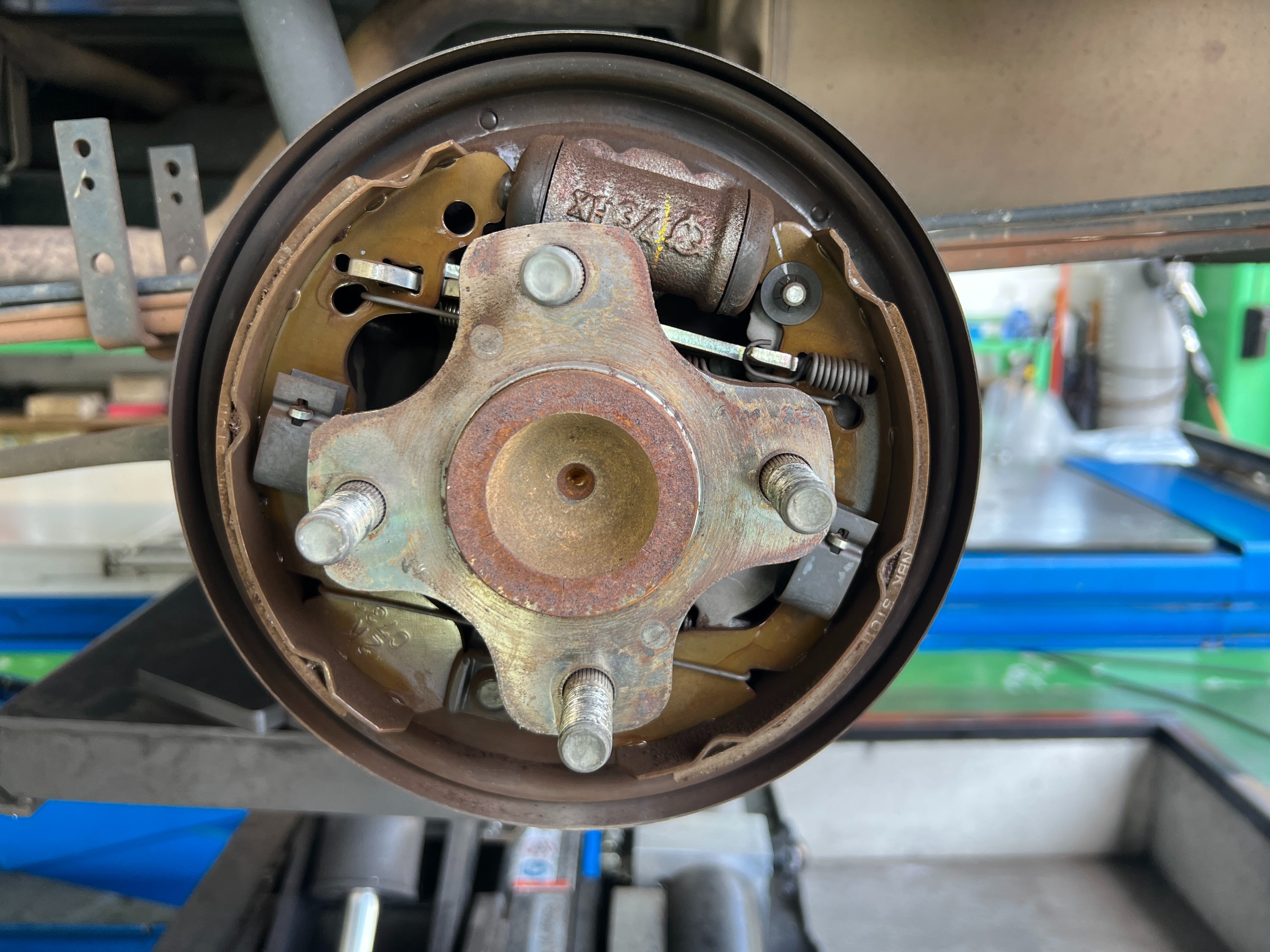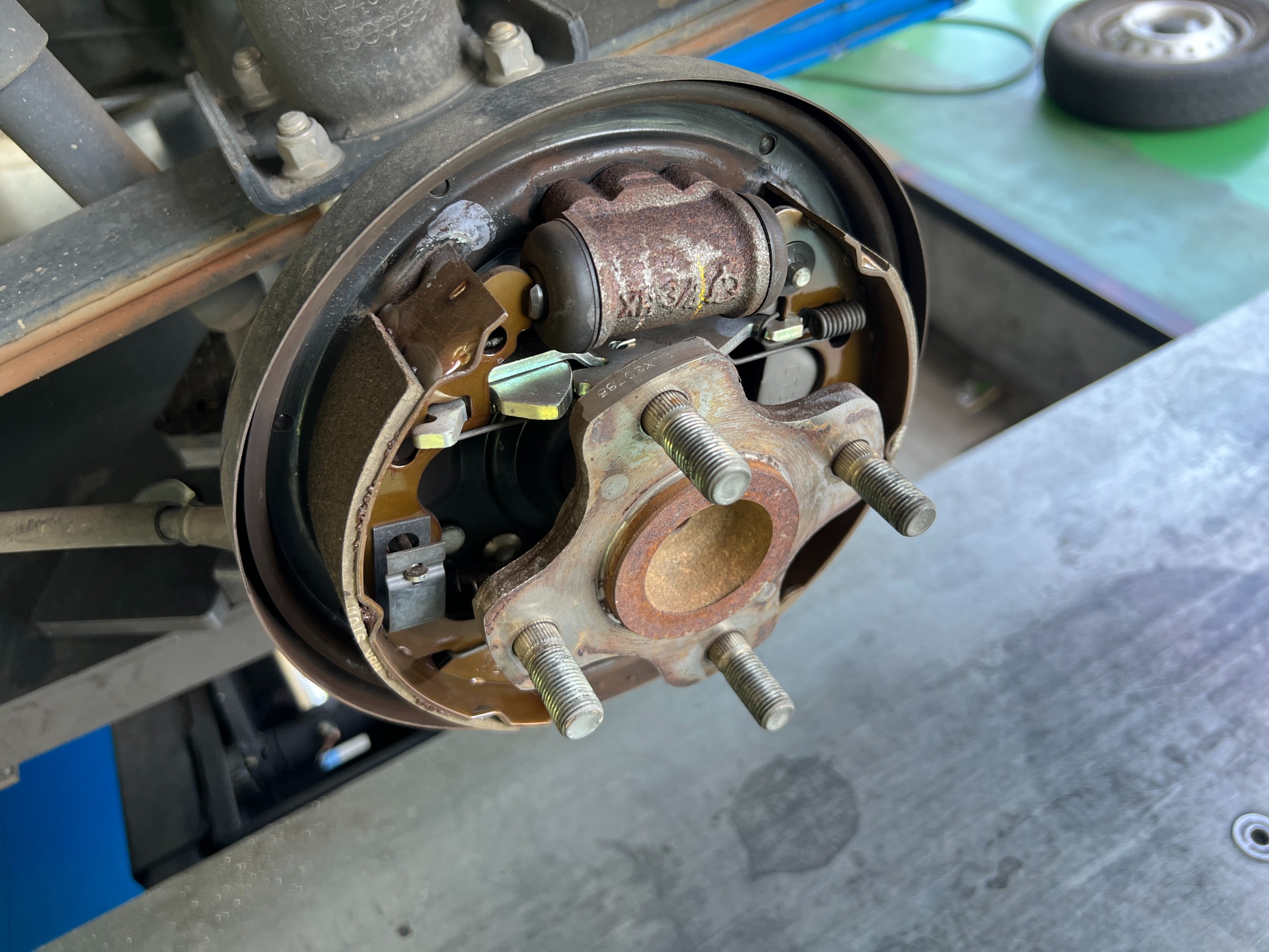 リアはドラムブレーキ構造になっています。ドラムを取り外して内部の状態も点検。ブレーキシュー,ホイールシリンダー,スプリング,作動状態などの確認
