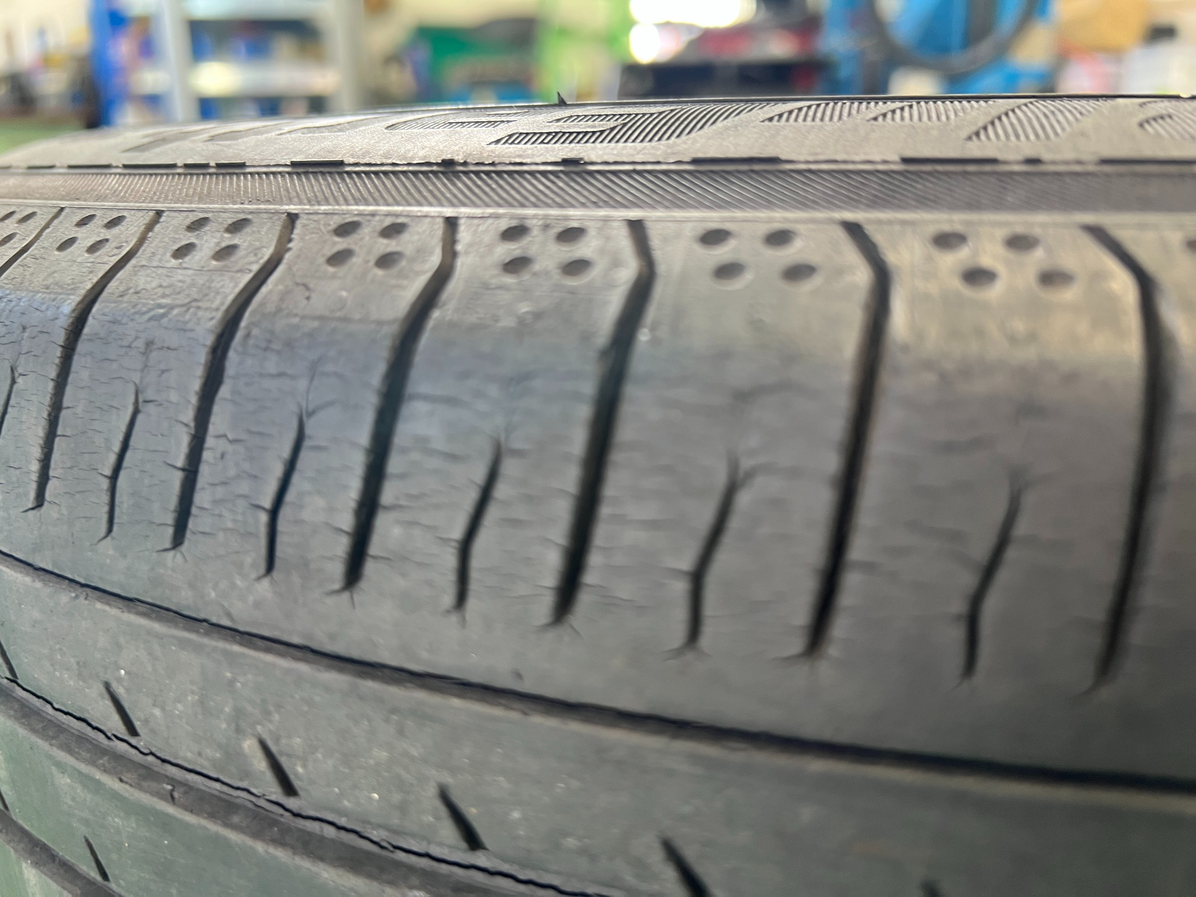 装着されていたタイヤは、溝の減りに加えて細かなひび割れも見られる状態でした。