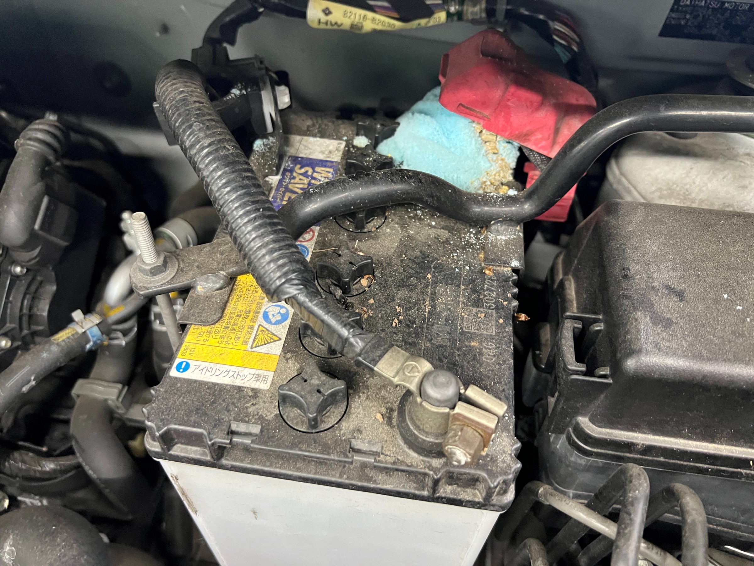 バッテリー端子付近に白い粉状の結晶、いわゆる塩吹きが見られました。