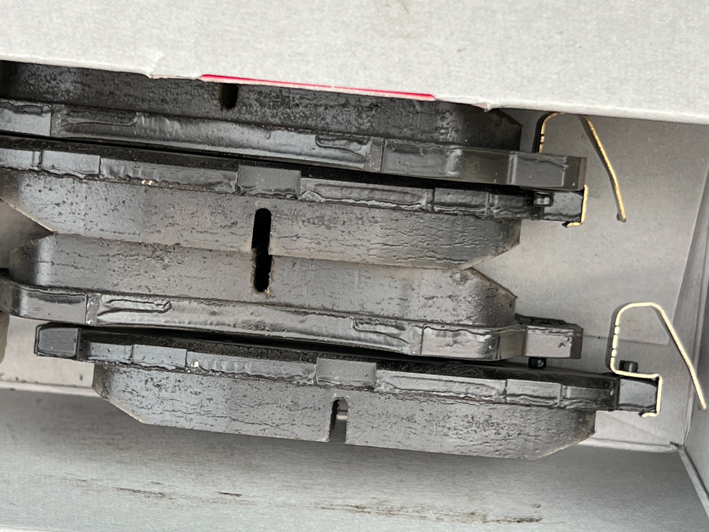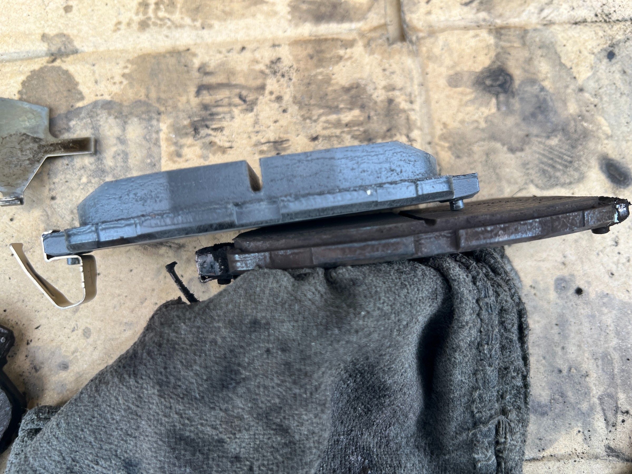 取り外したパッドと新品を比較すると、摩耗具合がよくわかります。