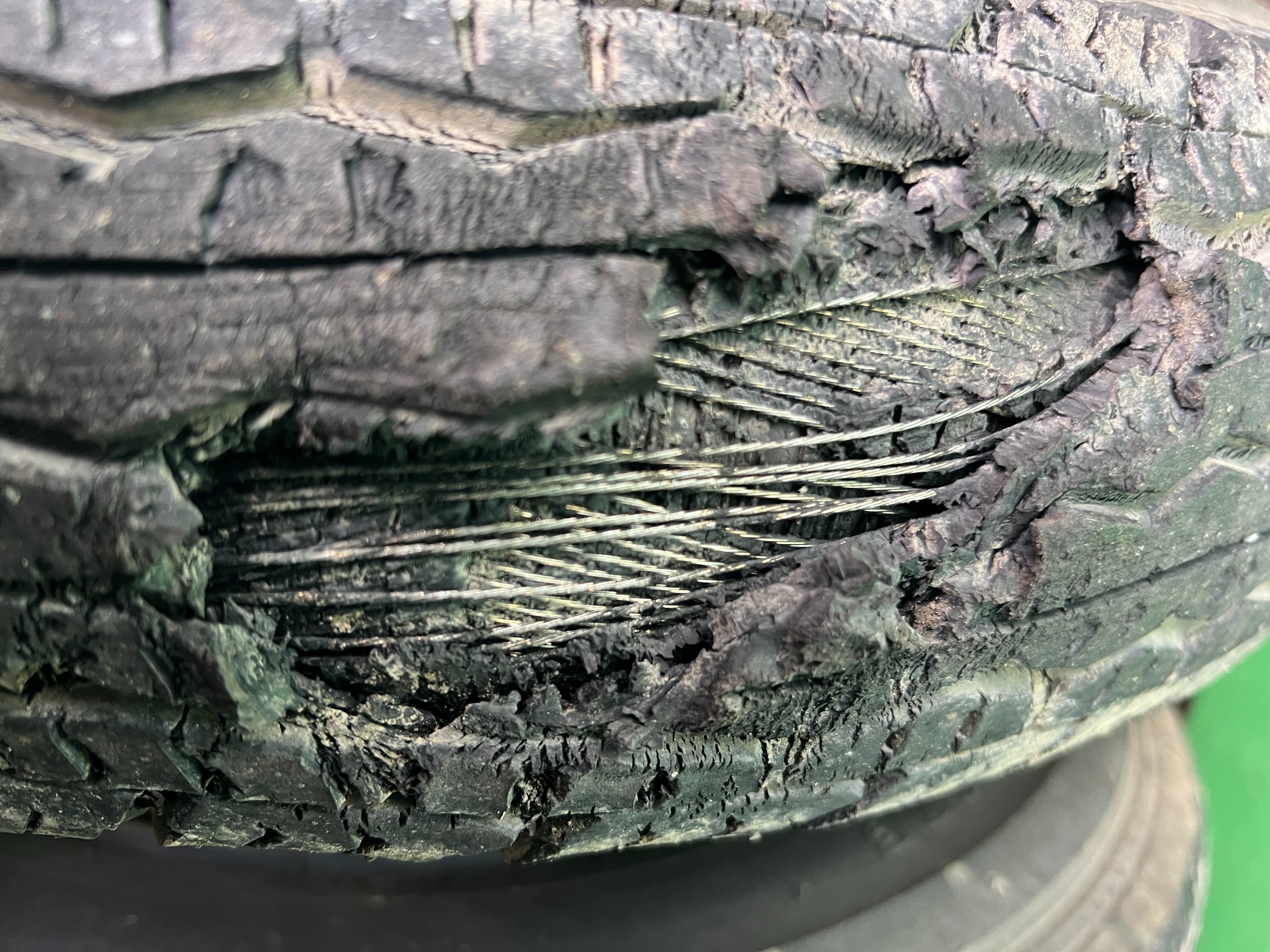 ここまで損傷が進むと、走行中の衝撃や発熱などをきっかけに突然のバーストにつながる可能性があります。