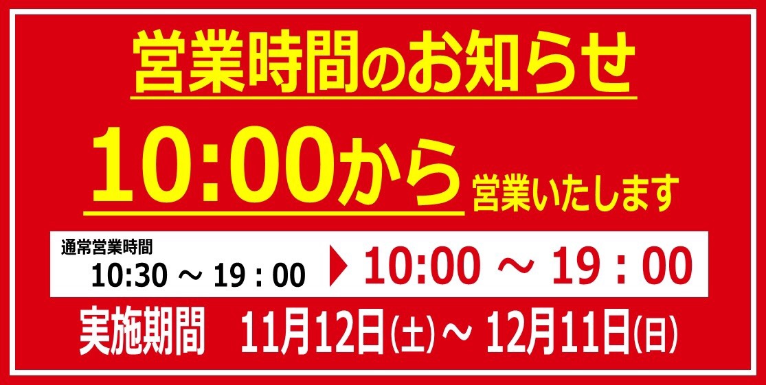 12日(土)より10時開店になり、営業時間に一部変更がございますので