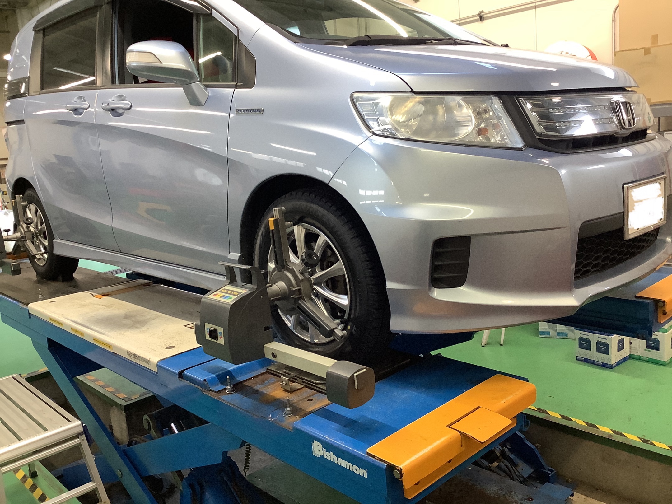さて今日は作業紹介。ホンダフリードのスタッドレスVRX2装着とアライメント調整をします^_^