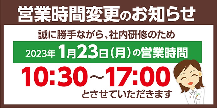 1/23(月)営業時間変更のお知らせ ポスト 2023年1月16日 いつもタイヤ館名取をご利用いただきありがとうございます。 誠に勝手ながら、1/23(月)は社内研修の為、17時までの 営業とさせていただきます。 大変ご不便をおかけいたしますが、 何卒ご理解賜りますようお願い申し上げます。 カテゴリ:お知らせ