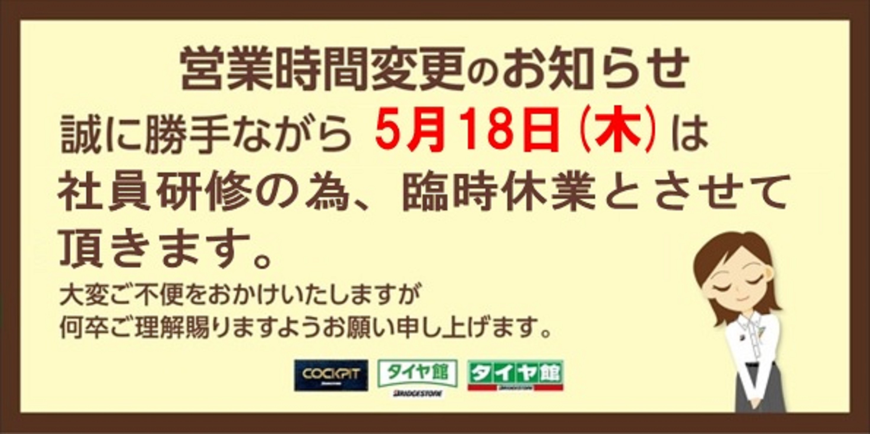 5月営業日のお知らせ ポスト 2023年4月20日 いつもタイヤ館名取をご利用いただきありがとうございます。 タイヤ館名取は5月9日(火)より10月24日(火)まで毎週火曜日が定休日となります。 また、5月18日(木)は社員研修の為臨時休業となります。 ご迷惑をおかけしますがよろしくお願いいたします。 営業時間は変わらず10:30〜19:00です。 タイヤ館名取スタッフ一同、皆様のご来店お待ちしております! カテゴリ:お知らせ