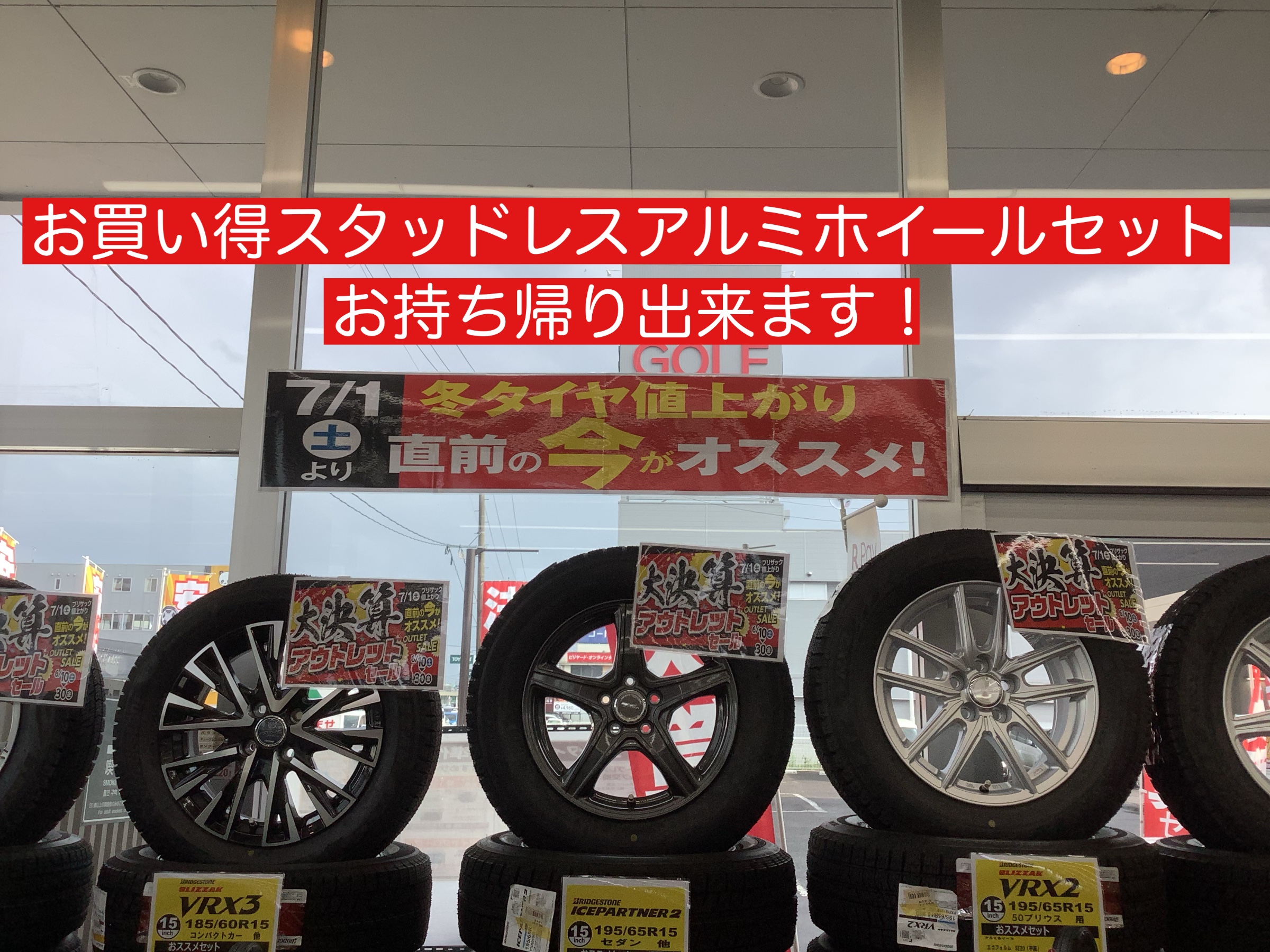 タイヤ館名取ではチラシのお買い得品の他にもお買い得なアルミホイールセットや数量限定のアウトレット品などご用意しております。
