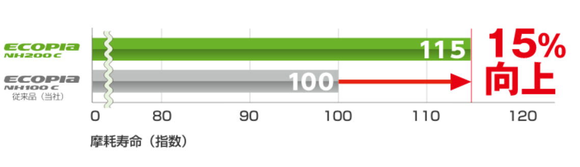 ECOPIA NH200Cは、タイヤの偏った摩耗を抑制する軽・コンパクト専用パタンとブリヂストン独自技術によって接地圧を均等化させています。高い耐偏摩耗性を実現することで、雨の日の安全性能を向上させました。