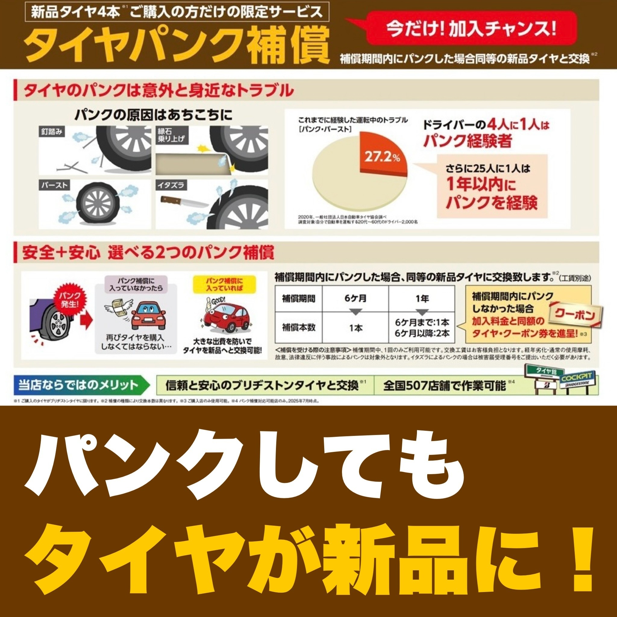 実はブリヂストン製タイヤご購入時ご一緒に加入が出来る「パンク補償」が人気なんです!