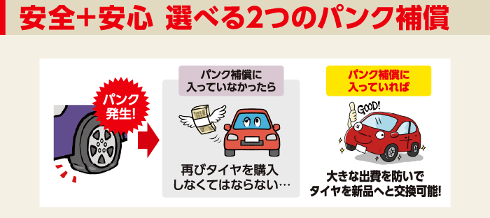 加入料はタイヤ割引クーポンで還元!パンクしても補償で交換!