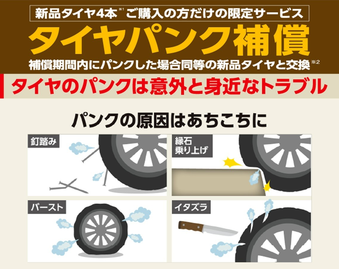 記事一覧 加入料はタイヤ割引クーポンで還元!パンクしても補償で交換! タイヤ館で「もしもの時のパンク」に備えて加入がオススメ!「パンク補償!」実はブリヂストン製タイヤご購入時ご一緒に加入が出来る「パンク補償」が人気なんです! 遠方へお出かけ時のトラブルも、全国507店舗のタイヤ館・コクピットにて対応が可能!※パンク補償対応可能店のみ。2025年7月時点... 2026年4月21日 ポスト