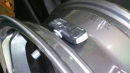 ホイールに取り付けられたセンサーでタイヤの空気圧を検知し、