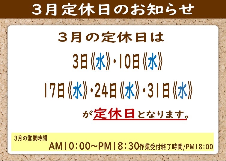 3月 定休日のお知らせ